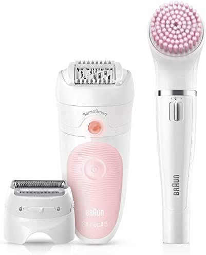 Meet the Beauty Set 5, the 6-in-1 hair removal and beauty set for face and body. Epilate, shave, trim, cleanse, exfoliate and apply creams and makeup. An exfoliating brush attachment removes dead skin cells to prevent ingrown hairs. The epilator removes 4x shorter hair than wax - for up to 4 weeks of smooth skin. The set includes a shaver and trimmer attachment for hair removal in sensitive areas. Three facial brush attachments for cleansing and exfoliating, and a makeup sponge for applying creams and makeup. Cordless use for up to 30 minutes. 100% Wet&Dry. Epilate while bathing or showering to reduce plucking sensation. With regular use, epilation is virtually painless.