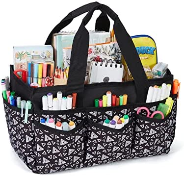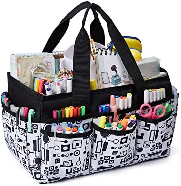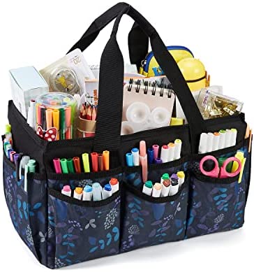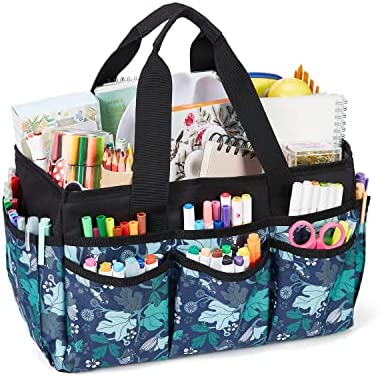 1. MULTI-PURPOSE - Wide open design with multiple Pockets around this canvas art craft caddy allows it suitable for scrapbook storage,Art &Craft,sewing tools,teaching staff,office supplies,make-up,etc.Moreover,An additional solid PP board in the bottom makes the craft storage bag good in shape and stable in structure.