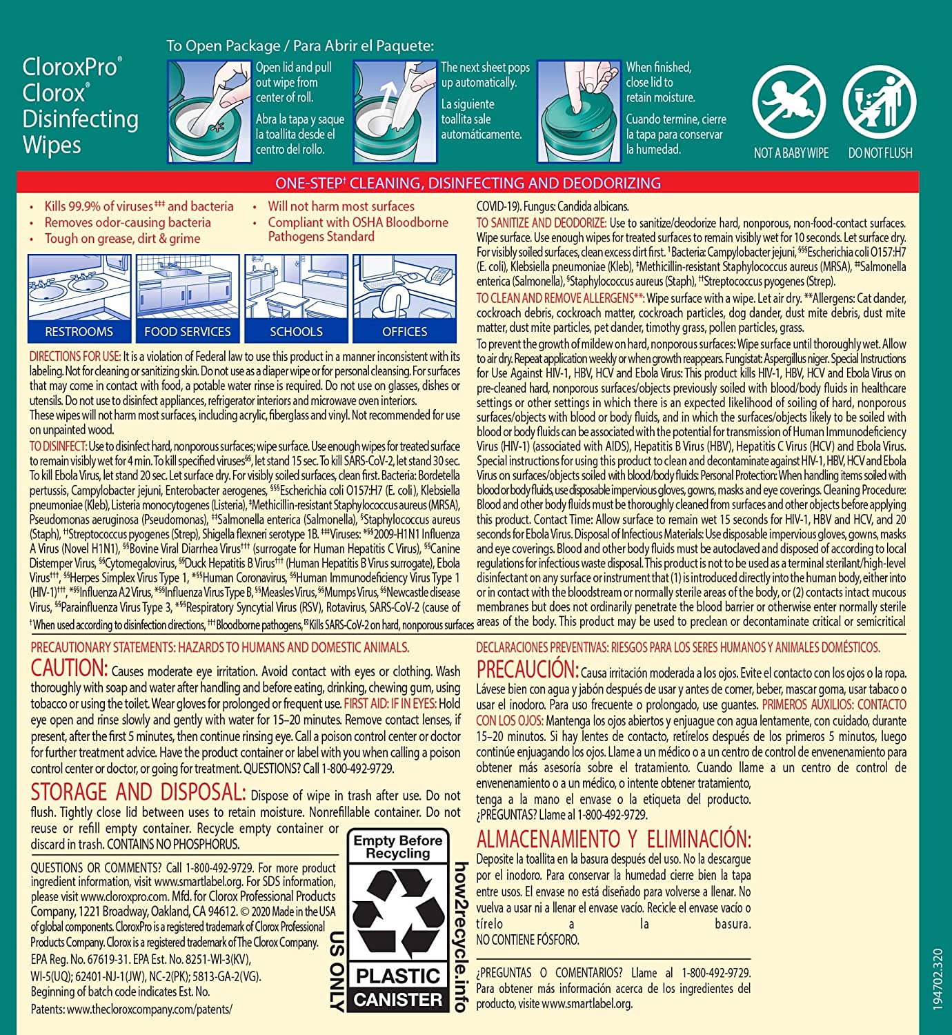 Clorox Commercial Solutions Disinfecting Wipes Clean And Disinfect In One Easy Step. These Disinfecting Wipes Are Epa-Registered To Kill 99.9% Of Germs On Hard Nonporous Surfaces, Including Cold And Flu Viruses, The Covid-19 Virus (Sars-Cov-2), E. Coli, Salmonella, Staph, Strep, Mrsa And The Organism That Can Cause Whooping Cough. These Wipes Also Remove Common Allergens Like Pet Dander, Pollen Particles And Grass. One Wipe Kills Most Viruses In As Little As 15 Seconds On A Wide Variety Of Surfaces. The Premoistened, Thick Wipes Are Perfect For Spills And Dirt On A Variety Of Hard, Nonporous Surfaces Including Acrylic, Glass And Vinyl. They Quickly Clean And Disinfect High-Touch Germ Hot Spots Such As Doorknobs, Handrails And Faucets And Are Suitable For Use On Phones, Keyboards And Mouse. These Sanitizing Wipes Are Ideal For Use In Shared Public Spaces, Offices, Athletic Facilities, Schools, Day Care Centers, Busy Healthcare Environments, Long Term Care And Other Commercial Facilities. Package May Vary.