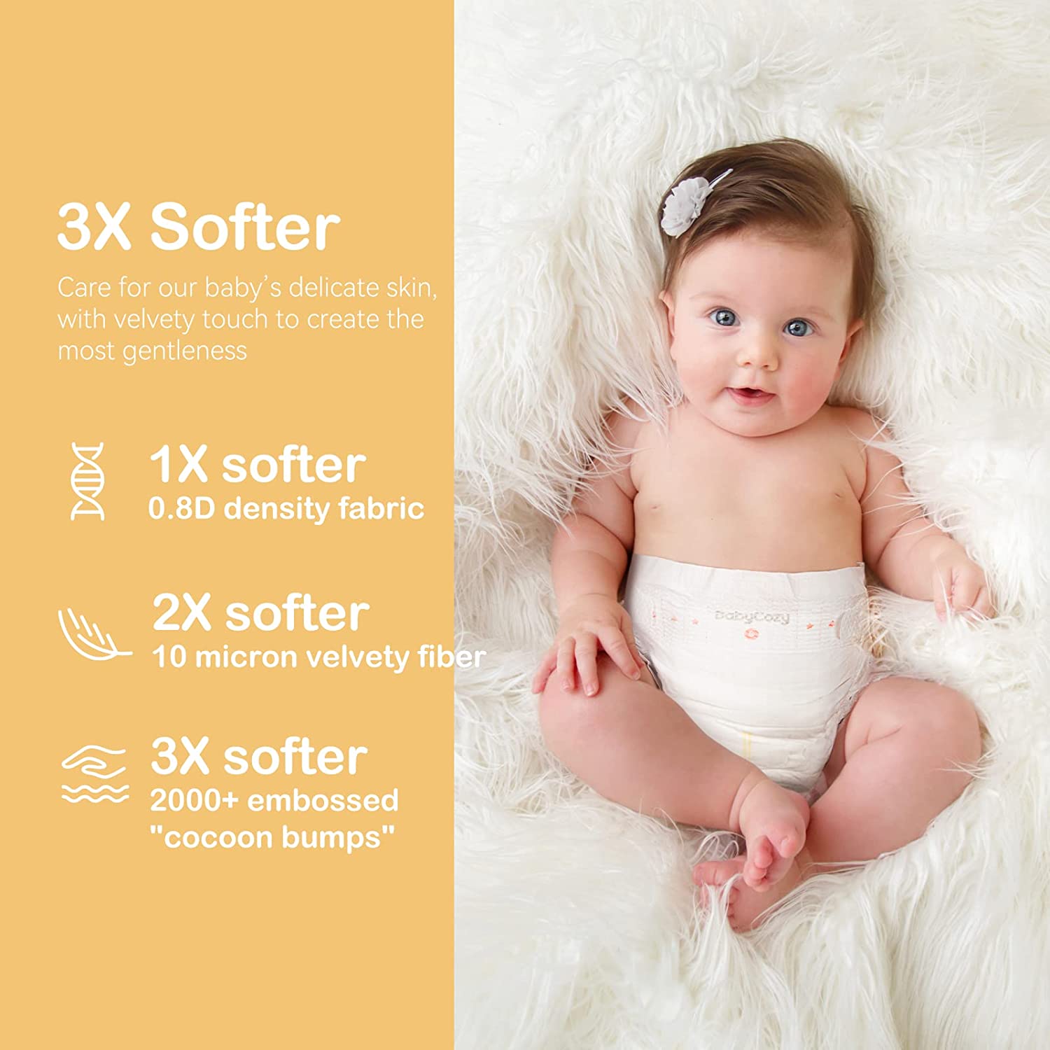 • ?【Velvety+Cottony 2X Bouncy Soft】Not only does the softness combo come from cotton fabric, but also from a velvety soft fabric. With the lightest 0.8D fabric density and 10 microns fiber which is 10 times smaller than hair, Babycozy disposable diapers barely leaves any scratch on the skin, greatly cutting the risk of baby tushy allergy or rash. Ultra soft-touch diapers are baby essentials for newborn which designed to bring the most velvety feel to baby’s skin in the gentlest way.