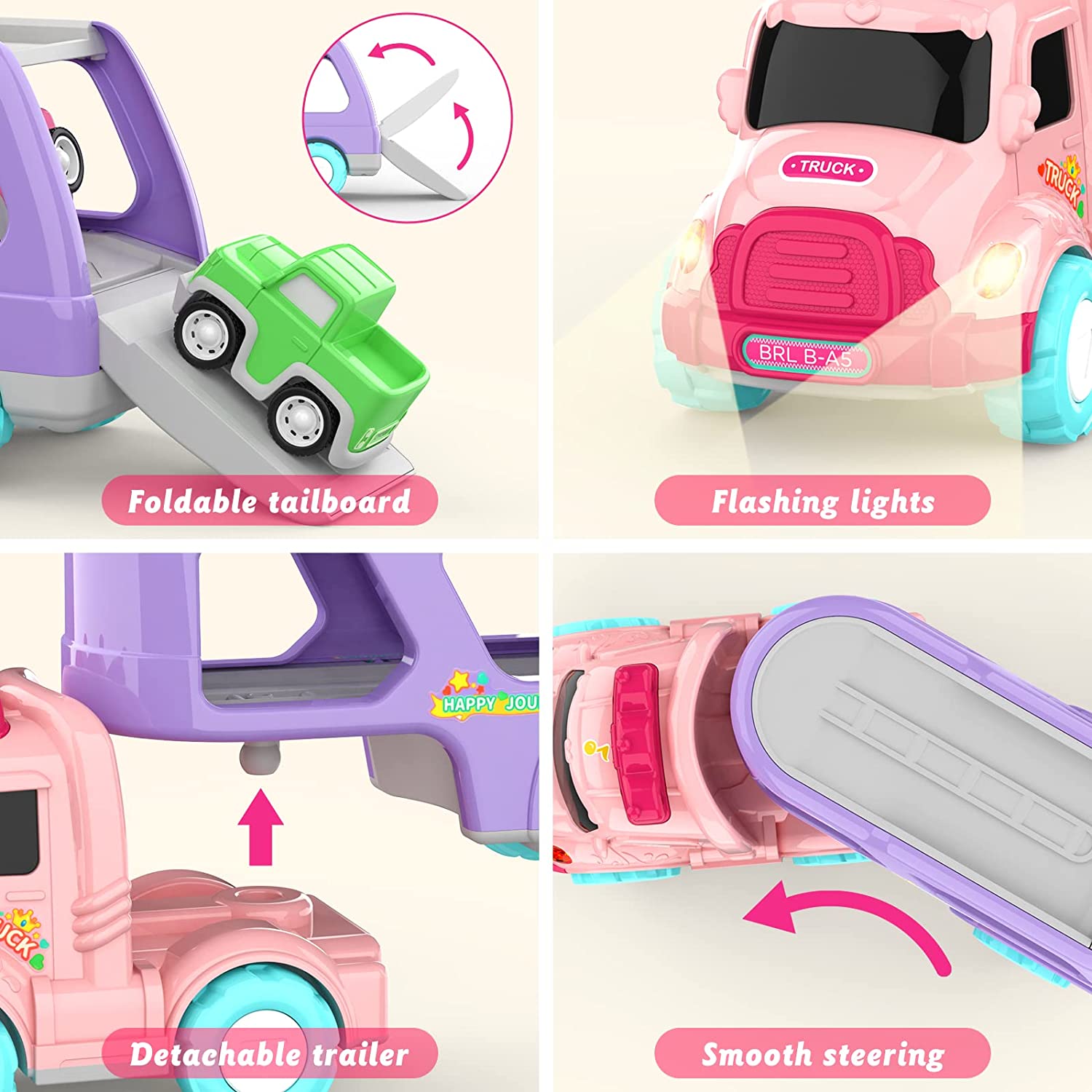 LASCOTON Toys for 1 2 3 Year Old Girl, 5-in-1 Carrier Truck, Toddler Girl Toys, Friction Power Toy Cars with Light & Sound, 1 2 3 Year Old Girl Gifts Birthday for Baby Girl Toys Pink Toys for Girls