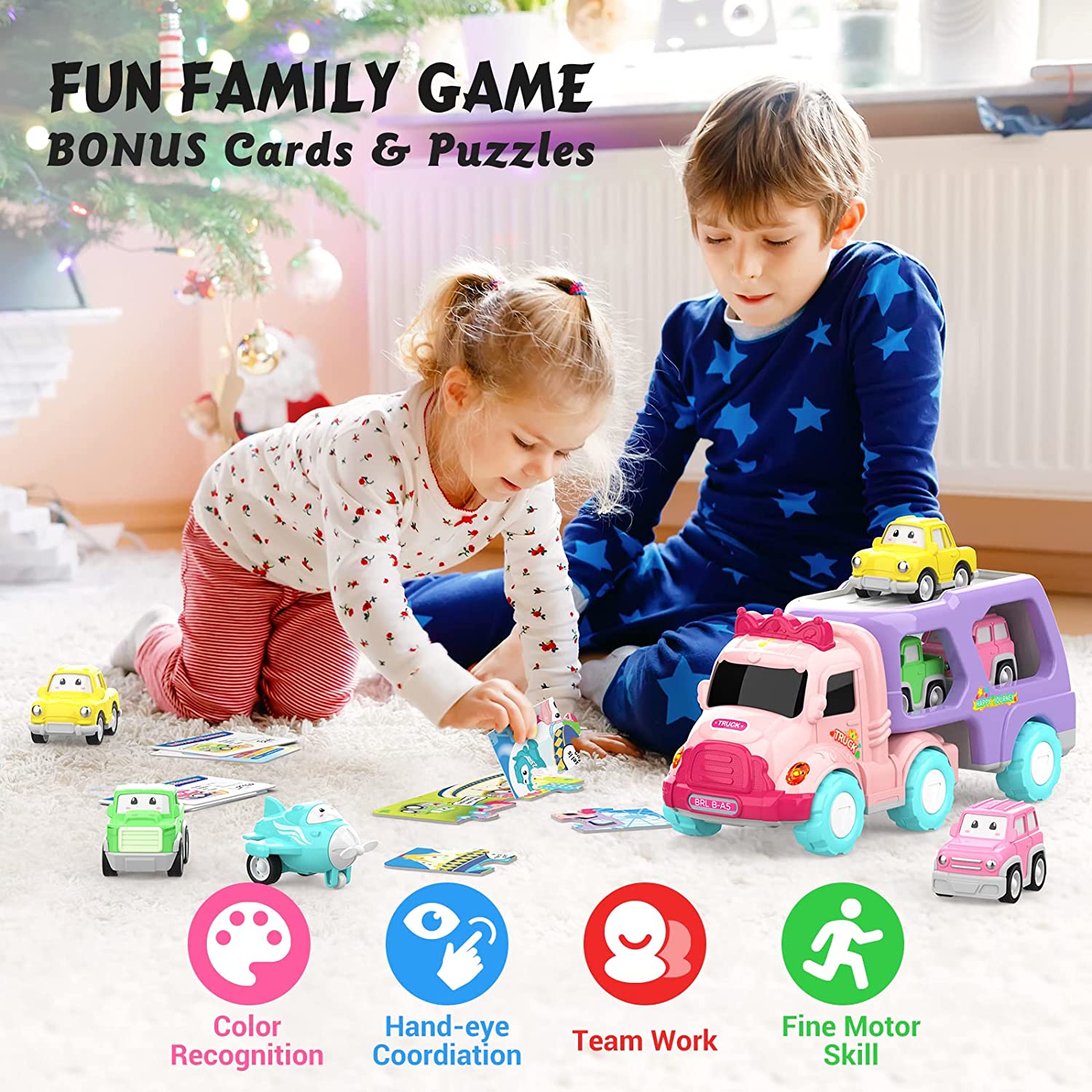 LASCOTON Upgraded Version Cars Toy Set --- 5-in-1 Carrier Truck Vehicles Toys for 1 2 3 Years Old Girls
