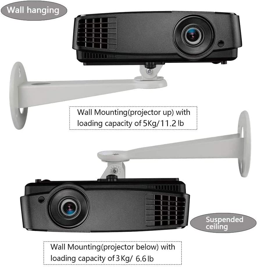 - ADJUSTABLE WALL HANGER: Quality Material, Carbon Steel. Around 11 lbs loading capacity with 360 degrees horizontal rotation projector mount head and 60 degrees vertically adjustable projector mount head.