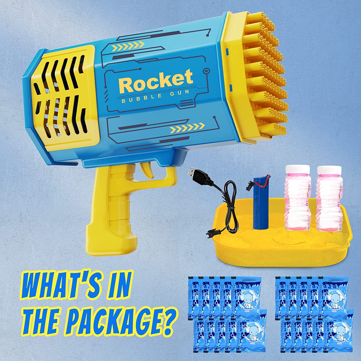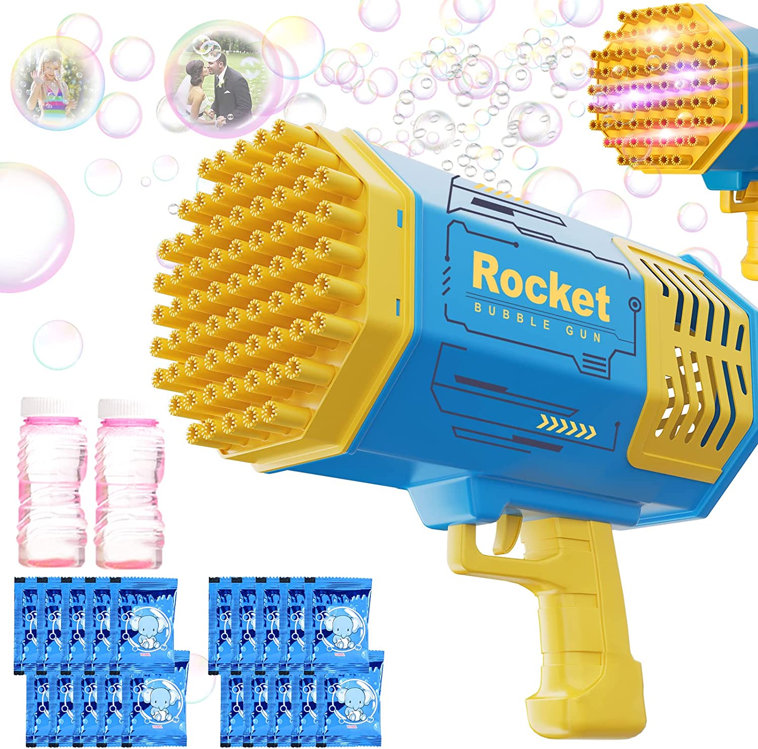 Pitpat 69 Holes Bazooka Bubble Gun - Rocket Boom Bubble Blower Extremely Large Number of Bubbles - Bubble Machine Gun with 2 Bubble Solution Refills and 20 Packs of Liquid Concentrate - Yellow & Blue