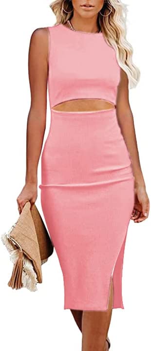 SHANZHEN Women's Summer Bodycon Midi Dress Solid Color Casual Crew Neck Hollow Cut- Out Long Sleeve/Sleeveless Dresses