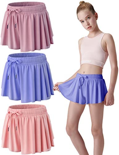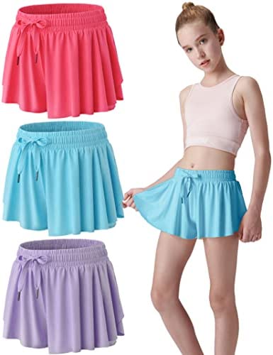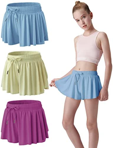 3 Pack Girls Flowy Shorts with Spandex Liner 2-in-1 Youth Butterfly Skirts for Fitness, Running, Sports