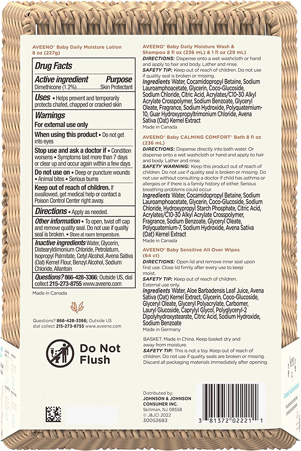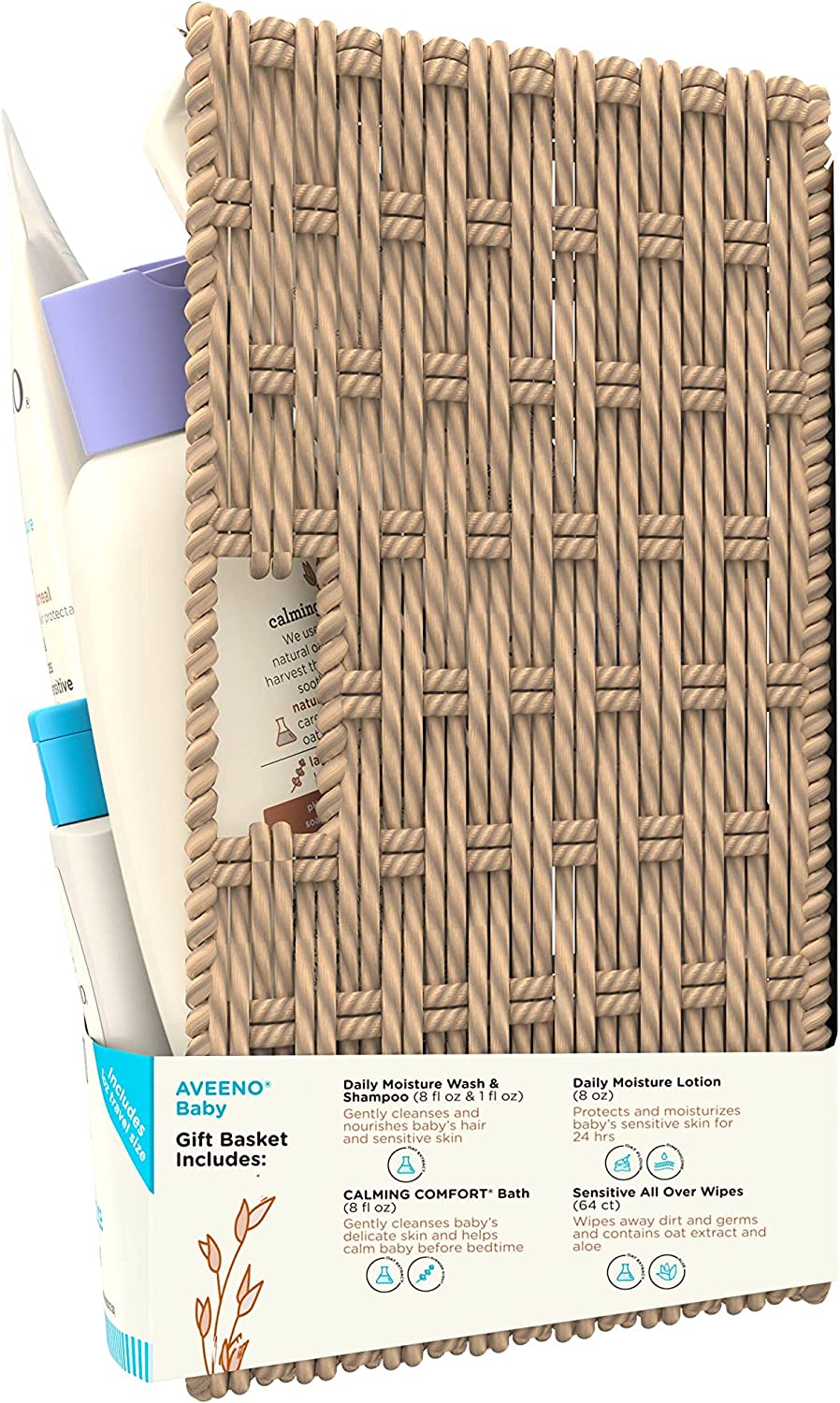 Aveeno Baby Welcome Little One Gift Basket with four skin care essentials specially formulated with oats for baby's delicate skin & hair. For parents & parents-to-be, this baby gift set includes baby wash & shampoo, calming bath wash, cleansing wipes & daily moisture lotion. Aveeno Baby Daily Moisture Wash & Shampoo has a tear-free, hypoallergenic formula that cleanses baby's hair & sensitive skin without drying, making it gentle enough for daily use. Aveeno Baby Calming Comfort Bath & Wash has soothing scents of lavender & vanilla to help relax baby before bedtime so they can experience a more restful sleep. Perfect for on-the-go, Aveeno Baby All Over Wipes with aloe & oat extract gently clean & leaves baby’s face, bottom, hands & body feeling moisturized. Aveeno Baby is a pediatrician & dermatologist recommended brand.