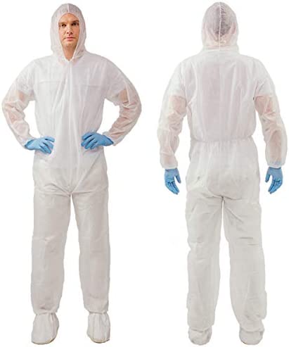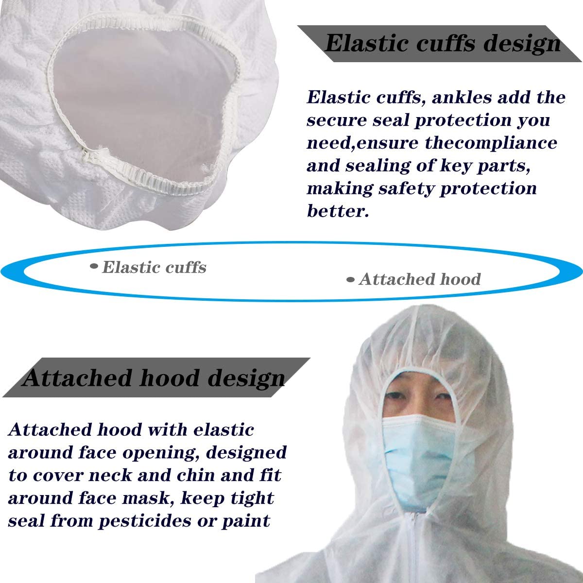 • 【PROTECTIVE OVERALL SUIT】Front zipper closure, easier donning and doffing, Elastic cuffs,waist,ankles add the secure seal protection you need ensure a snug fit. Attached hood with elastic around face opening, designed to cover neck and chin and fit around face mask, keep tight seal from pesticides or paint