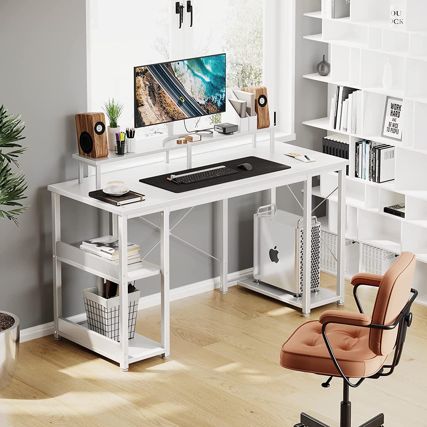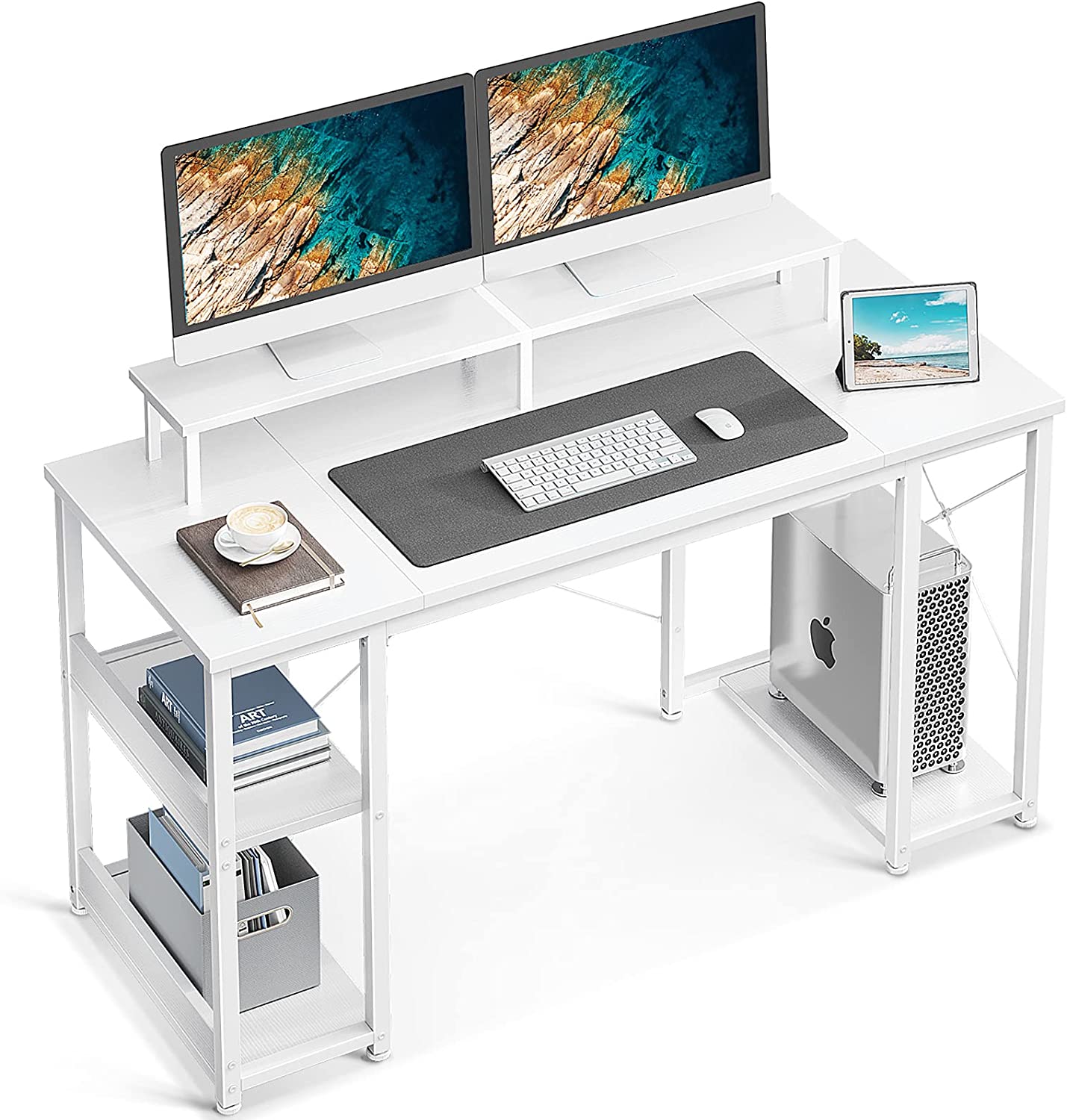 ODK 48 inch Computer Desk with Monitor Shelf and Storage Shelves, Writing Desk, Study Table with CPU Stand & Reversible Shelves, White