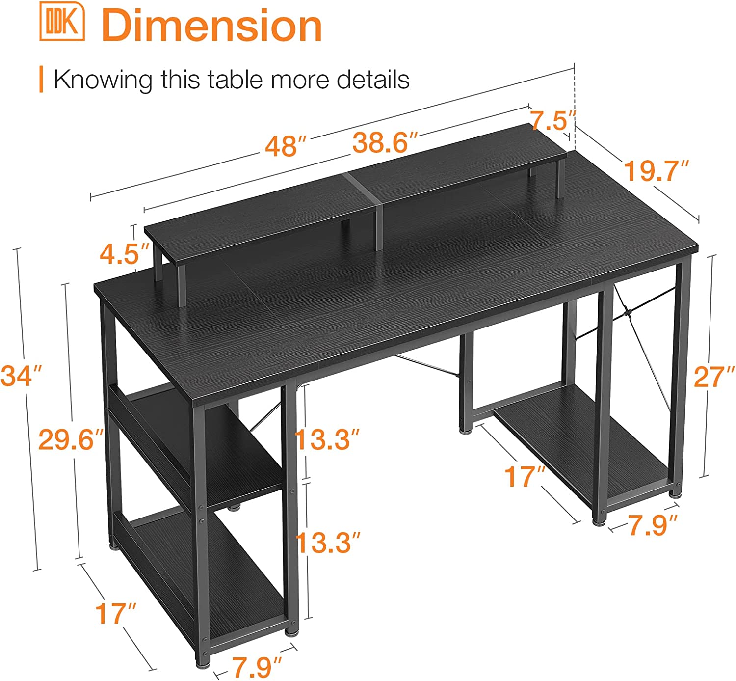 • 【Enrich Space】ODK office desk with shelves provide you plenty of under-desk storage room for books, working documents, office stuff. The open shelves keep everything in easy reach. 2 level adjustable shelf height allows different size computer host to put in.