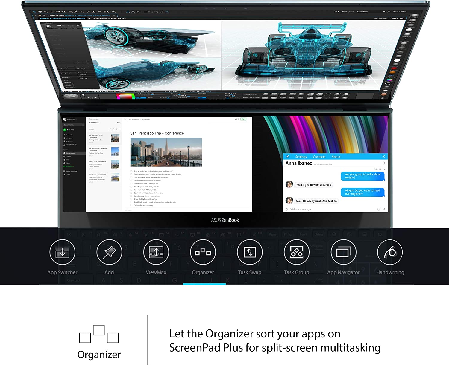 ASUS ZenBook Pro Duo UX581 with ScreenPad™ Plus gives you on-the-go computing like you’ve never experienced before. The 4K secondary touchscreen that works seamlessly with the main 15.6 inch 4K UHD OLED touchscreen, giving you endless ways to optimize and personalize your workflow. A series of handy built-in apps help boost your productivity. Quick Key allows one-tap automation of complex keyboard sequences and Handwriting lets you input text intuitively. Task Group lets you lock into work mode by opening multiple tasks with a single touch and now you can drag apps or in-app toolbars onto ScreenPad™ Plus to give you more room to work on the main display, wherever you are. There are also useful quick control functions such as App Switcher, ViewMax and Task Swap for intuitive interactions between the main display and ScreenPad™ Plus. With ZenBook Pro Duo and the bundled stylus, you can really let your creativity flow. Both multi-touch displays support stylus input and ScreenPad™ Plus gives you a superbly ergonomic and stable platform for writing or drawing. Take notes, sketch out your ideas, or do precision graphical editing in the most intuitive way ever. There’s also a separate palm rest in the box, which enhances the ErgoLift tilting keyboard design to give you the most comfortable typing experience ever. ZenBook Pro Duo is powered by up to a 10th Generation Intel® Core i9 eight-core processor, the latest gaming-grade NVIDIA GeForce RTX 2060 graphics, and blisteringly fast storage. This ultra powerful combination ensures that ZenBook Pro Duo takes professional-quality tasks in stride, such as multi-layer photo or video editing, 3D graphics rendering, or even game live-streaming. *The actual transfer speed of USB 3.0, 3.1, 3.2 (Gen 1 and 2), and/or Type-C will vary depending on many factors including the processing speed of the host device, file attributes and other factors related to  system configuration and your operating environment. Duo can effortlessly handle all the apps on your main screen and screenpad Plus, for the most fluid cross-screen workflow ever.