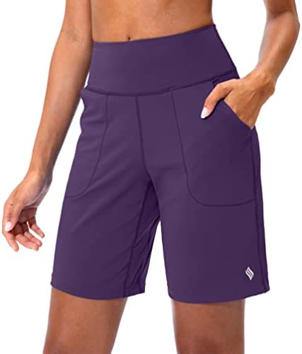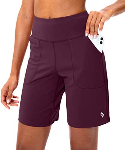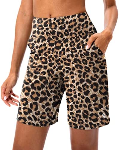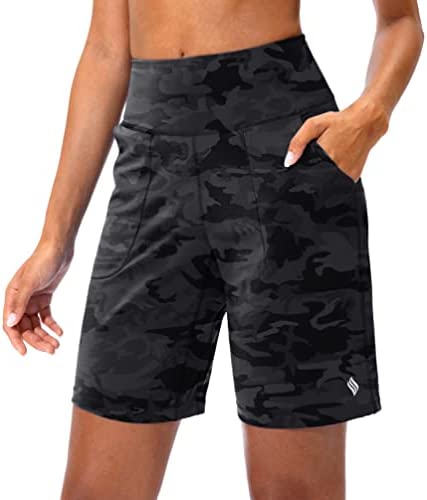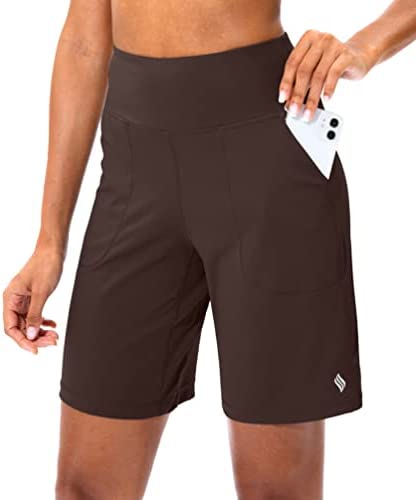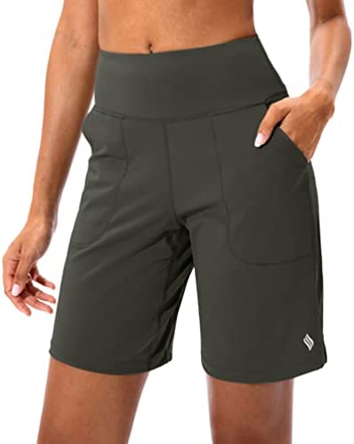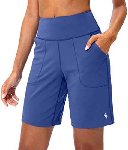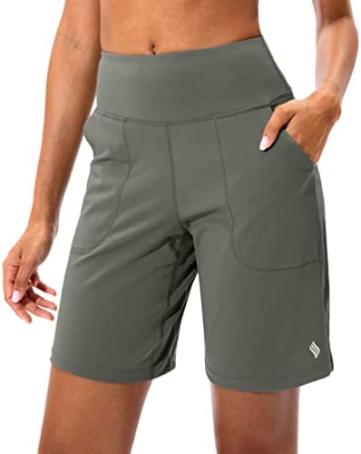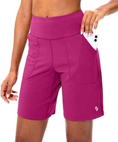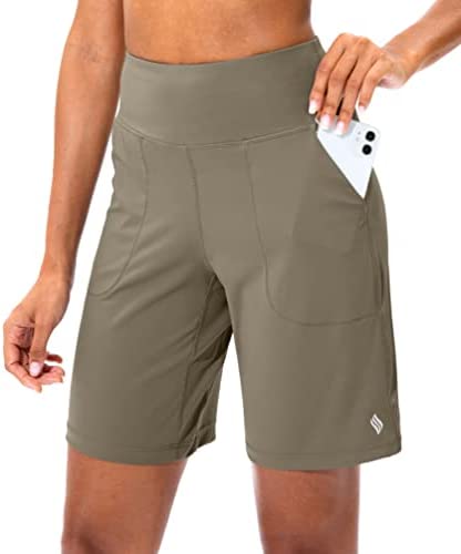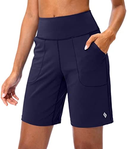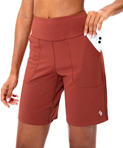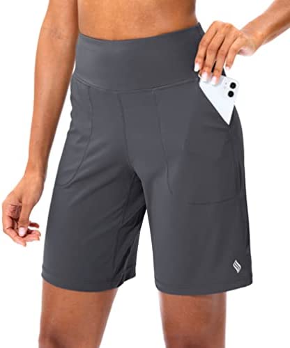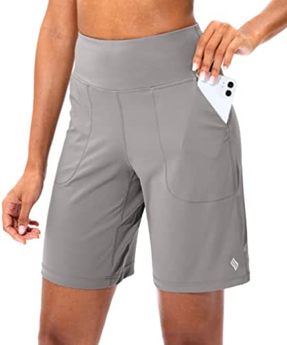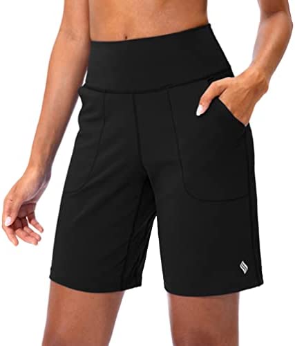SANTINY Bermuda Shorts for Women with Zipper Pocket Womens High Waisted Long Shorts for Running Workout Athletic