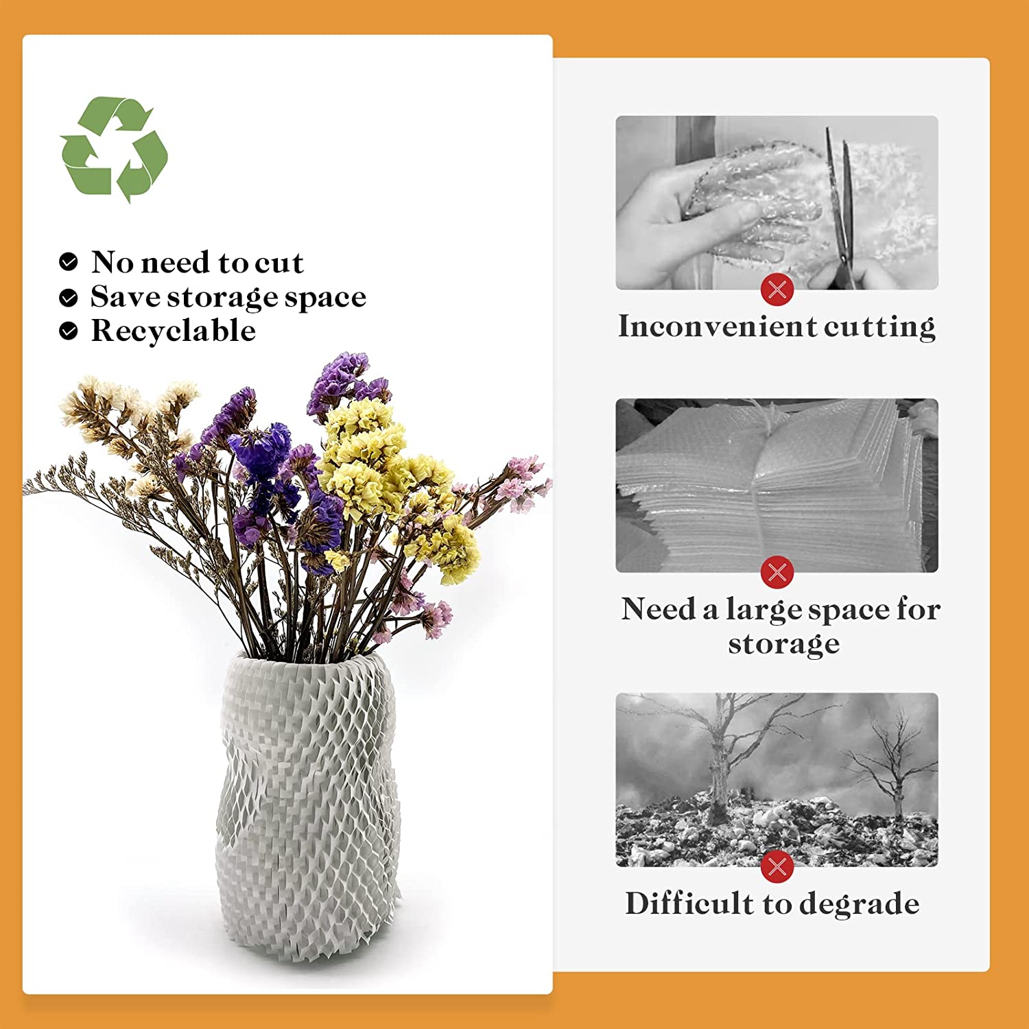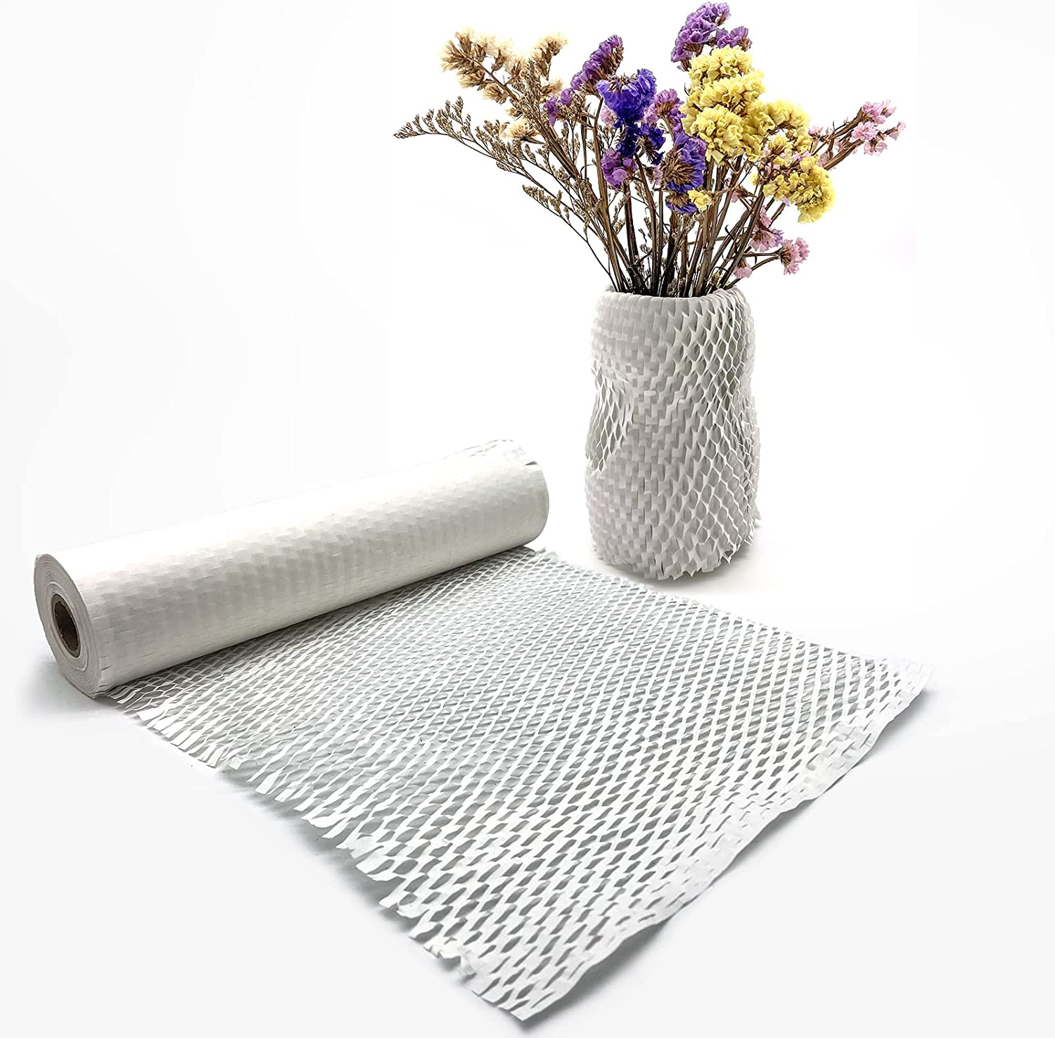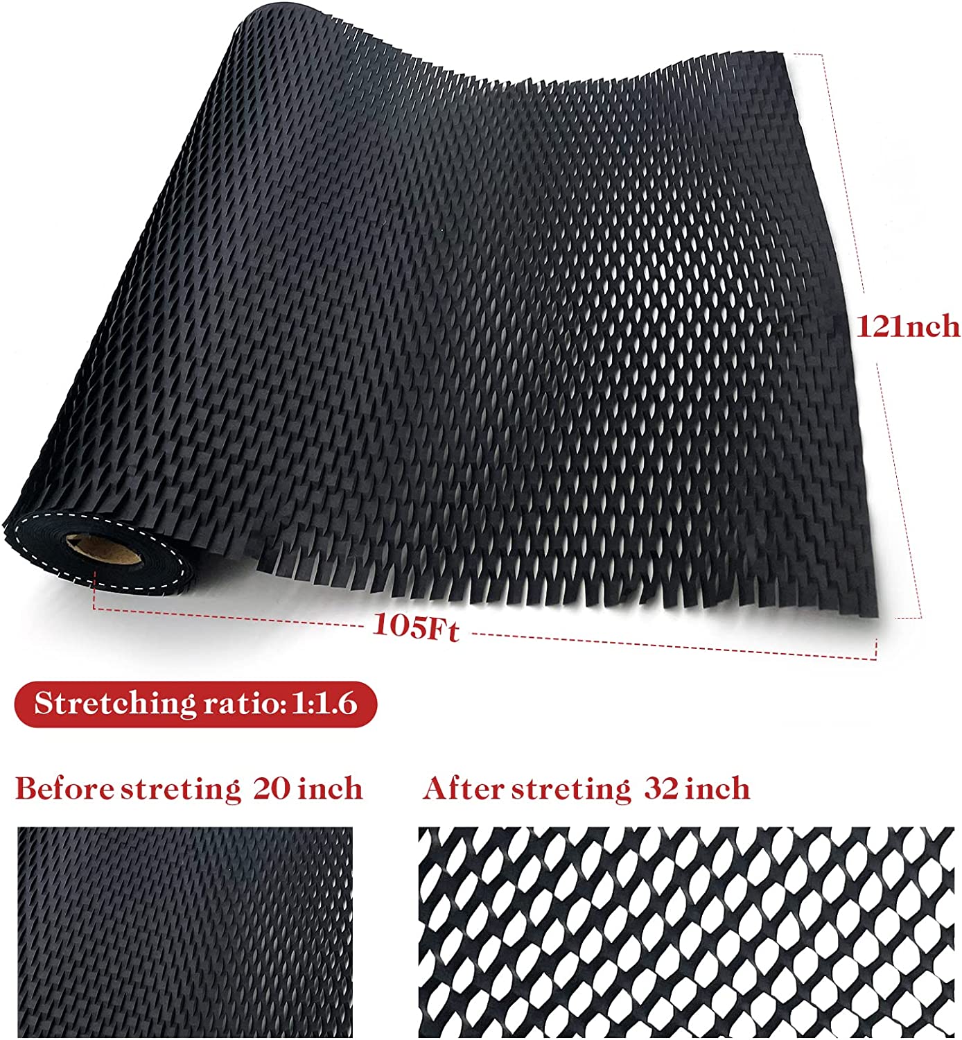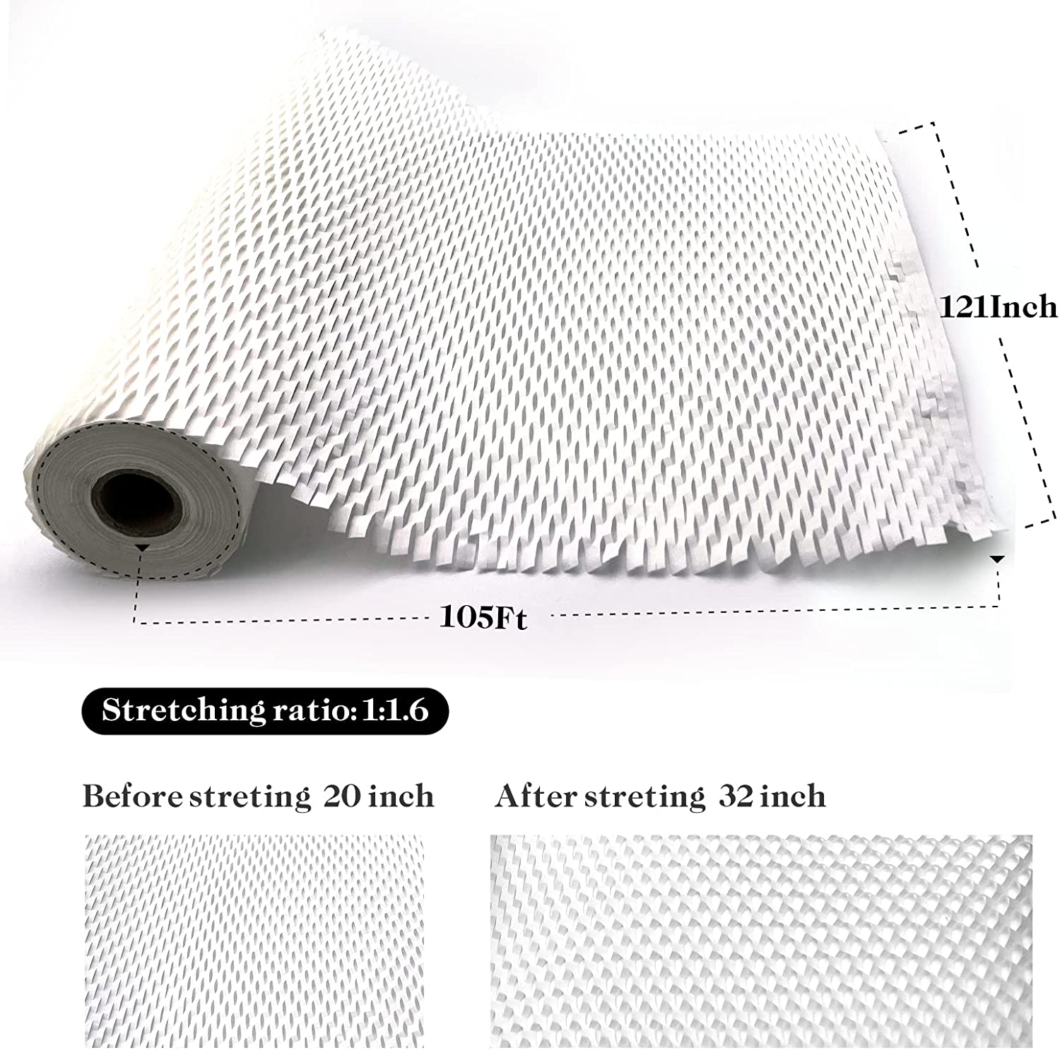 • Space saving: the size of the honeycomb paper roll before stretching is 12" wide and 105' long. When stretched, the size of the honeycomb paper roll is 11.5" wide and 168' long, so the honeycomb wrapping paper is easy to carry, saving storage space and transportation cost.