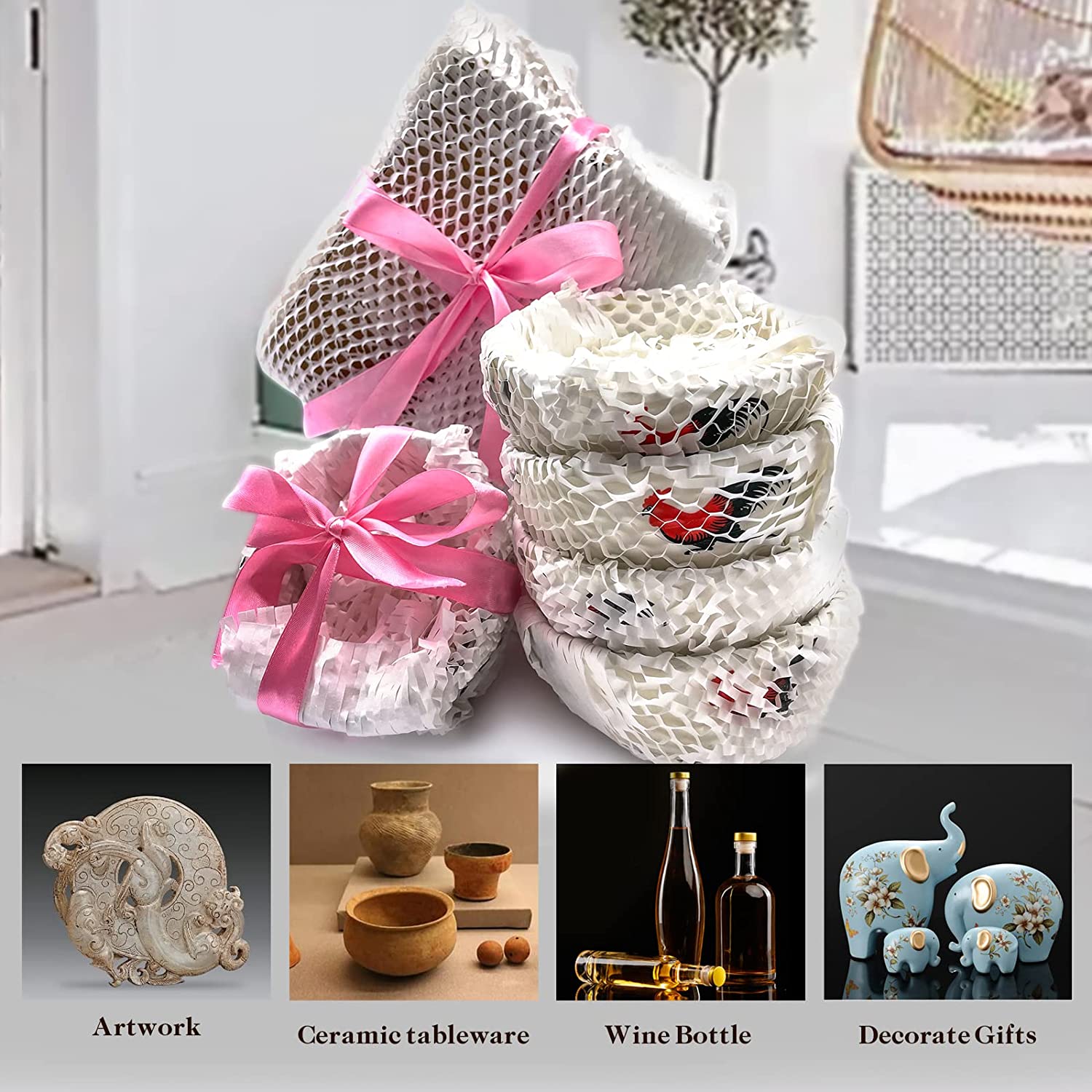 • Wide range of uses: Honeycomb cushioning paper is suitable for packaging fragile or need to protect items, ceramic tableware, cups, plates, vases, wine box packaging, artwork, etc. Good cushioning properties are used to keep items intact and effectively reduce fragility Products collide with each other and cause rupture.