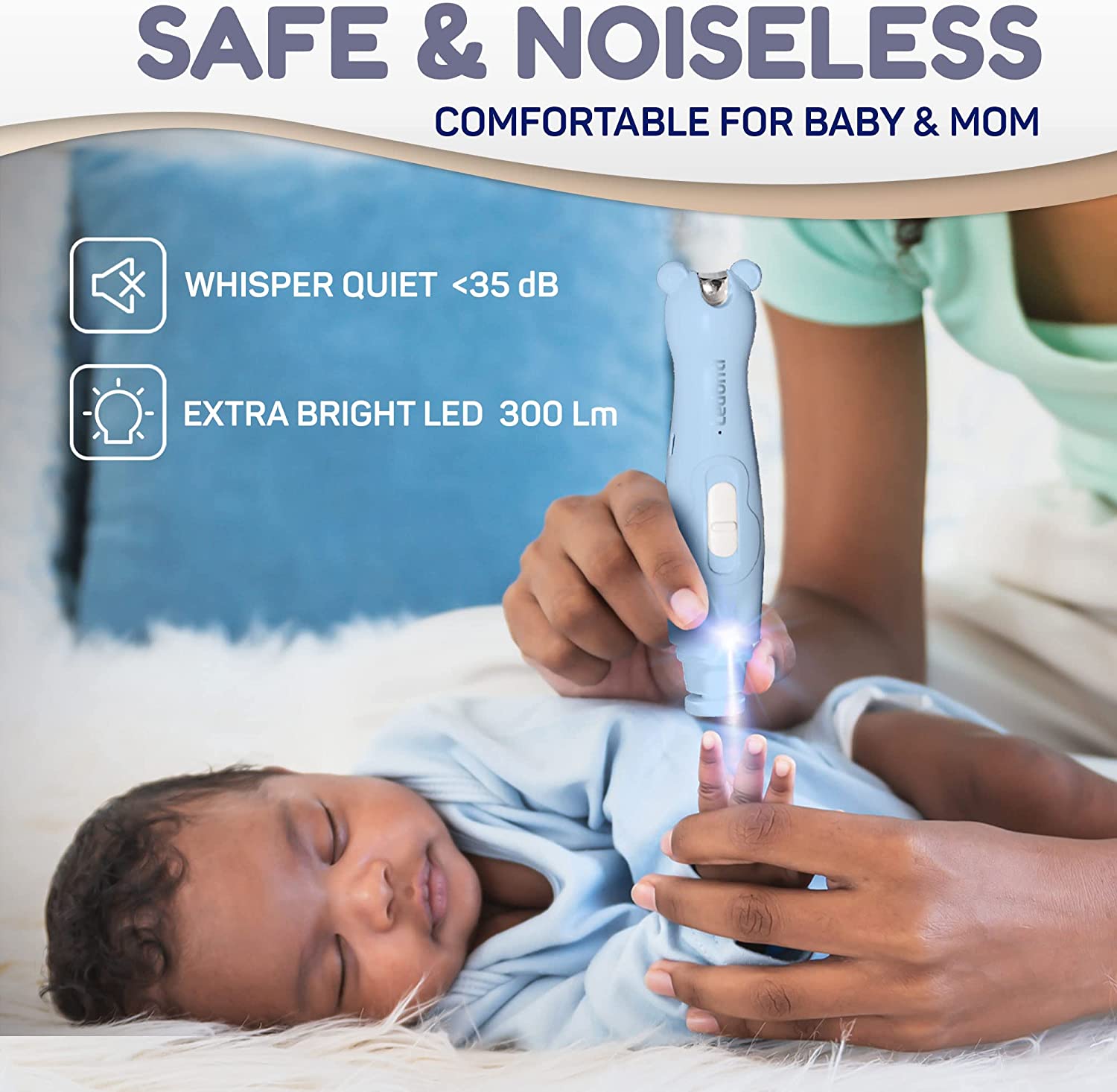 • NOISELESS & LED LIGHTED: No more guessing while grinding your baby's nails. The in-built LED light guarantees safe trimming and ultimate visibility even when the lights are out. Nothing will trouble your kid's sensitive sleep due to the whisper-quiet motor (less than 35 DB).