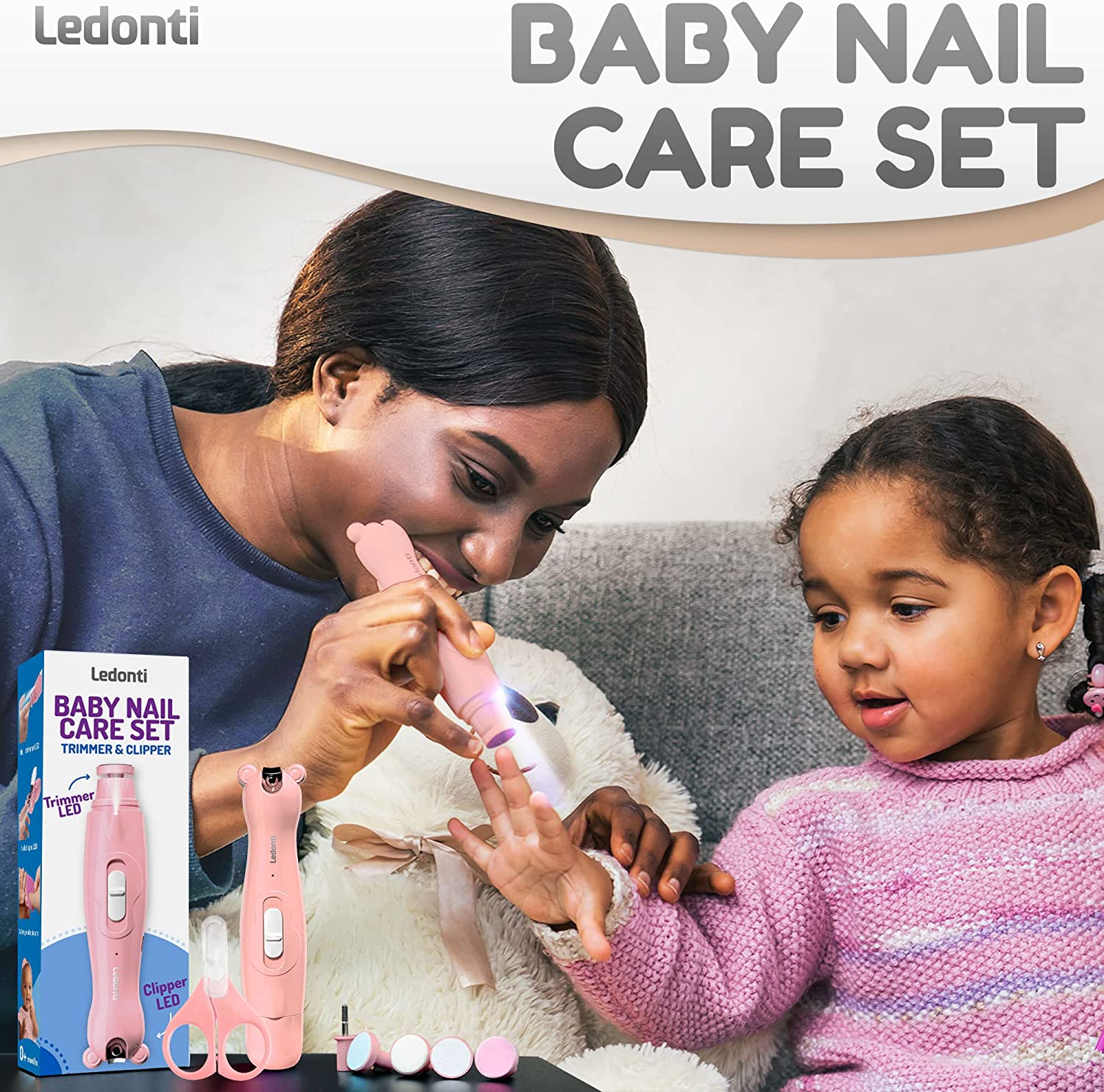• ALL-IN-ONE BABY NAIL KIT for safe nail care of babies, kids, and their parents. Baby nail trimmer electric LED with 6 replaceable grinder heads and sandpapers. Safety clippers with curved steel blades and LED light. Ultra-safe scissors with a protective cap. A convenient storage bag. Get a professional nail care set for the whole family.