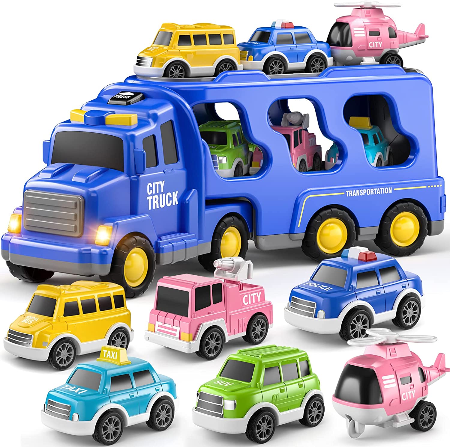 5 IN 1 CARTOON VEHICLE TOY: This transport city car truck set includes a larger carrier truck and 4 small school bus, taxi car, police car and SUV. It is highly recommended for kids aged 3 and above to create endless happy times!