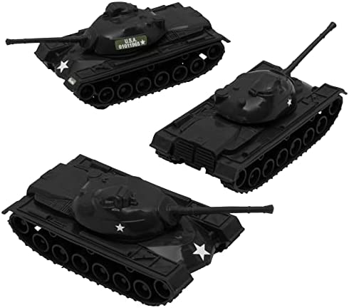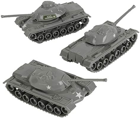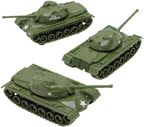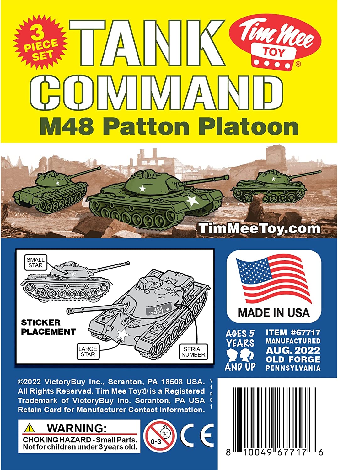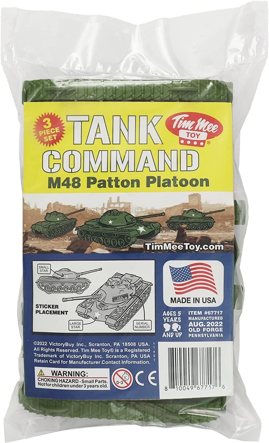 The Tim Mee Toy Patton PlatoonTank Division is ready for back yard deployment. These #729 M48 Patton Tanks are proudly manufactured in the United States and available in this 3 piece set. Each tank features a turret that rotates, measures 6.5 inches long and is approximately 1:48 scale. Made from slightly stiff OD green color HDPE plastic with lots of crisp detail and very little flashing.