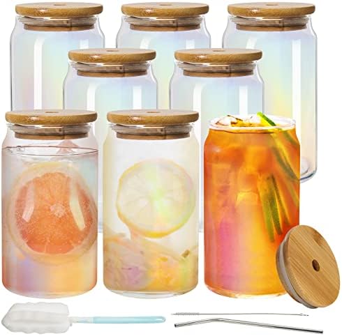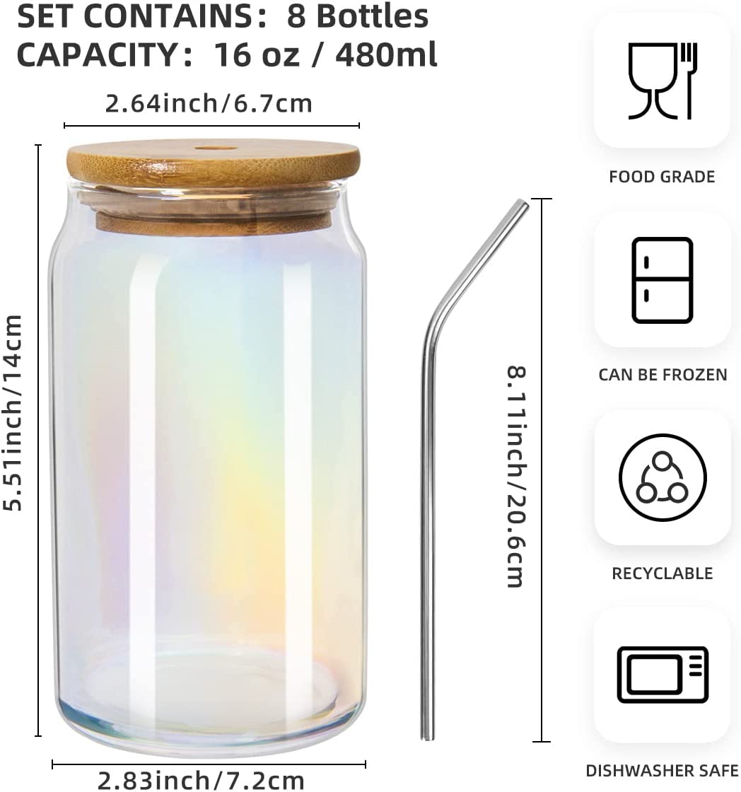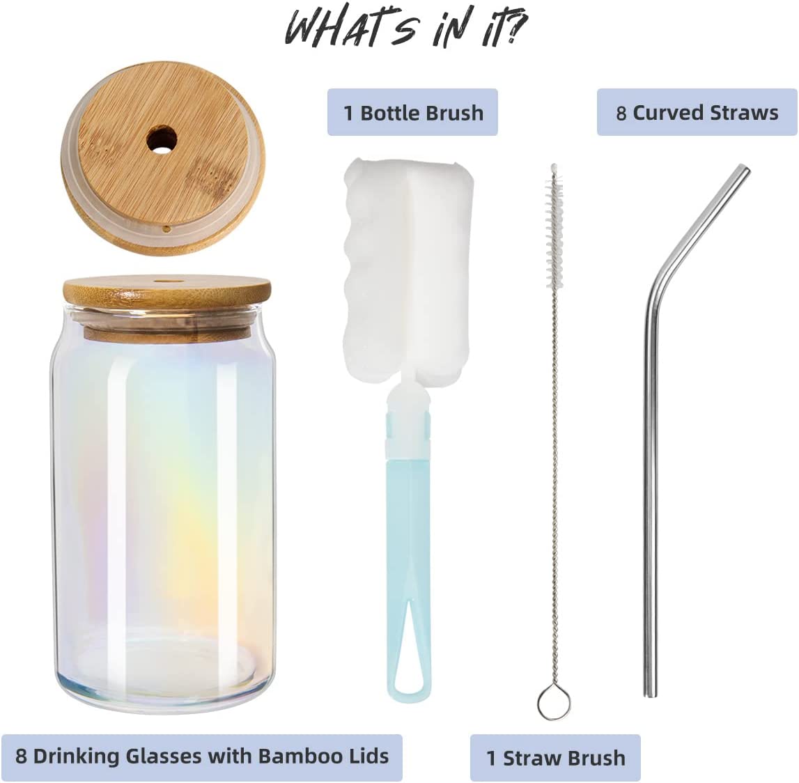 • 8 Pack Beer Glasses:Juice bottle set includes 8 beer can glasses, 8 nature bamboo lids, 8 stainless steel straws, 1 bottle brush and 1 straw brush.They are all dishwasher safe and refrigerator safe.