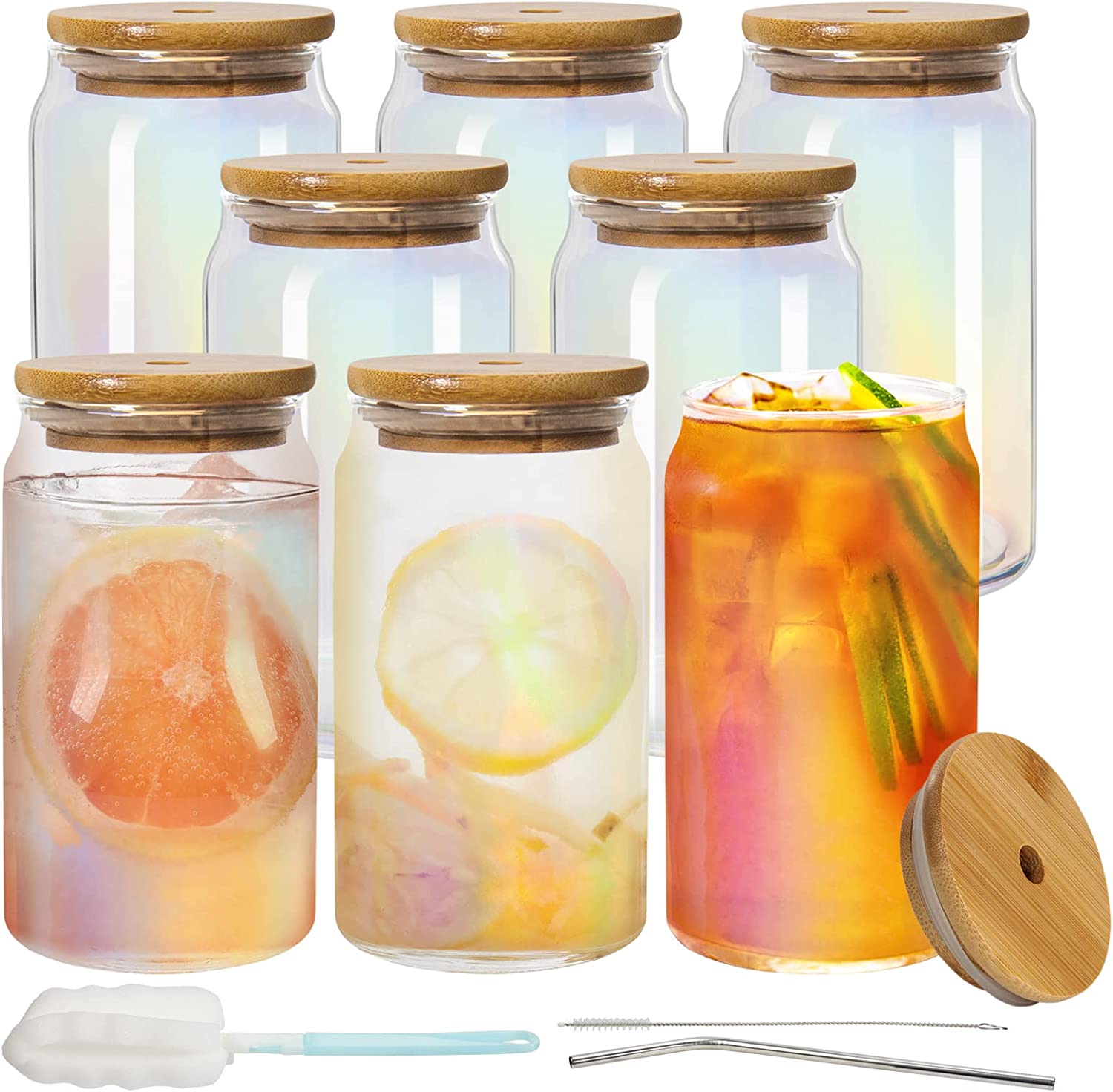 16oz 8 Pack Drinking Glasses with Bamboo Lids and Straw, RUCKAE Beer Can Glass Cups,Iced Coffee Cup,Glass Tumbler with Straw and Lid, Can Shaped Glass Cups for Beer,Smoothies,Cocktail,Whiskey