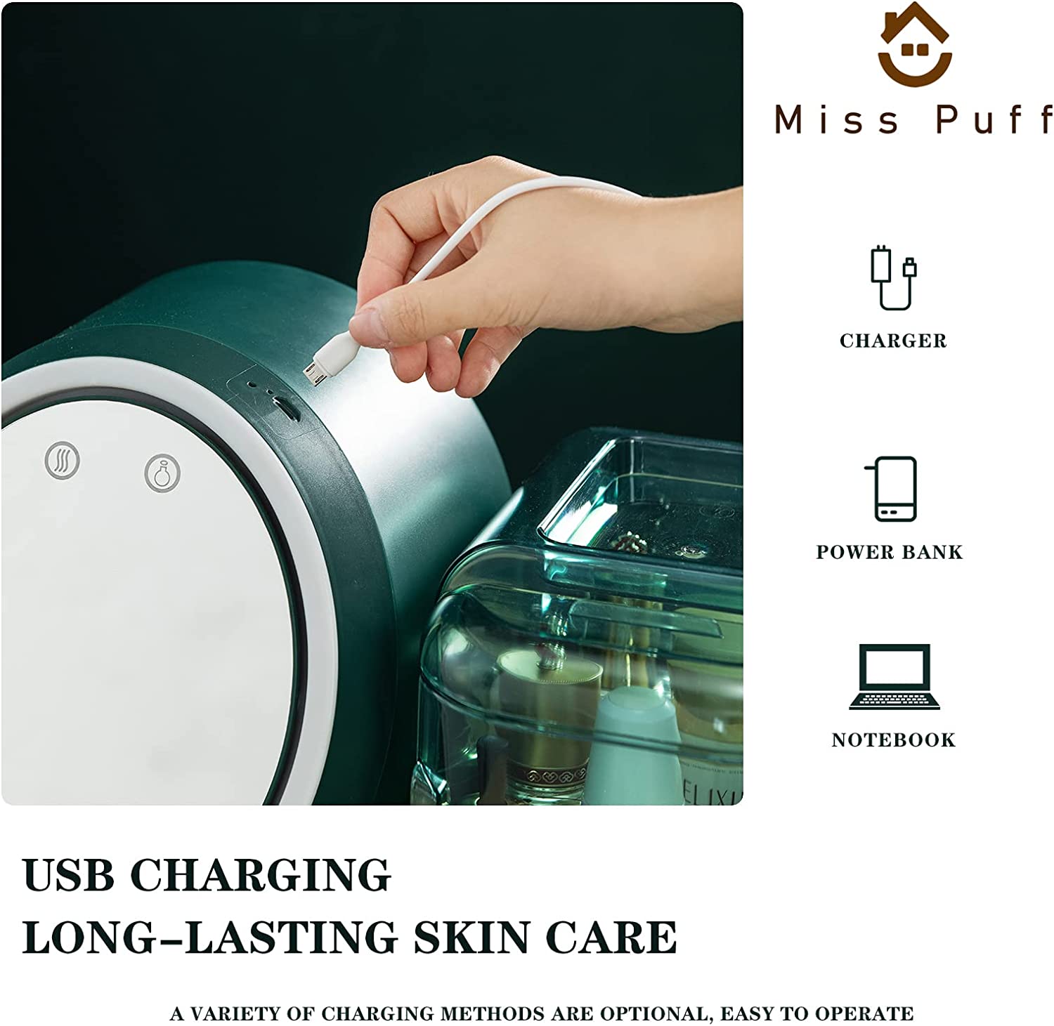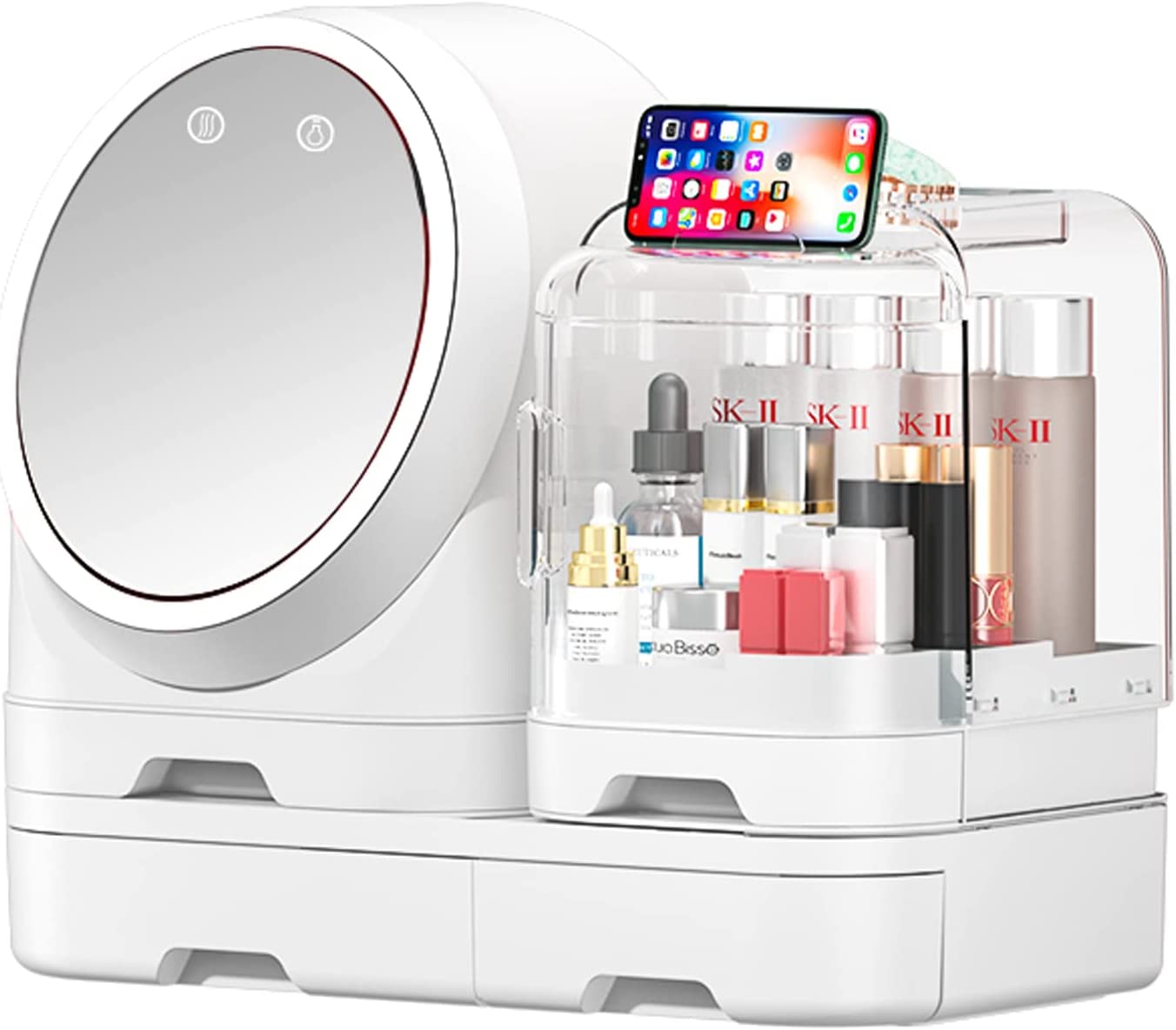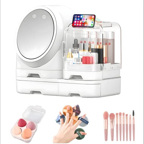 Miss Puff Makeup Organizer with LED Mirror and Fan, Large Capacity Cosmetic Storage Display Case, Waterproof and Dustproof Skincare Organizer for Bathroom and Vanity Dresser