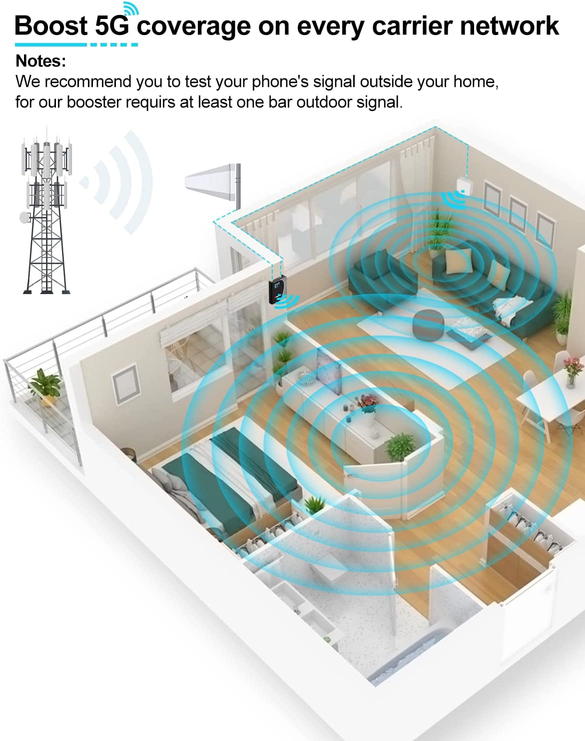 • Drill-free installation — No drilling holes in your walls. Just feed the included flat window cable to connect the signal booster to the outside antenna. Then place the inside antenna on a shelf or mount on a wall with the included 3M Command strips.