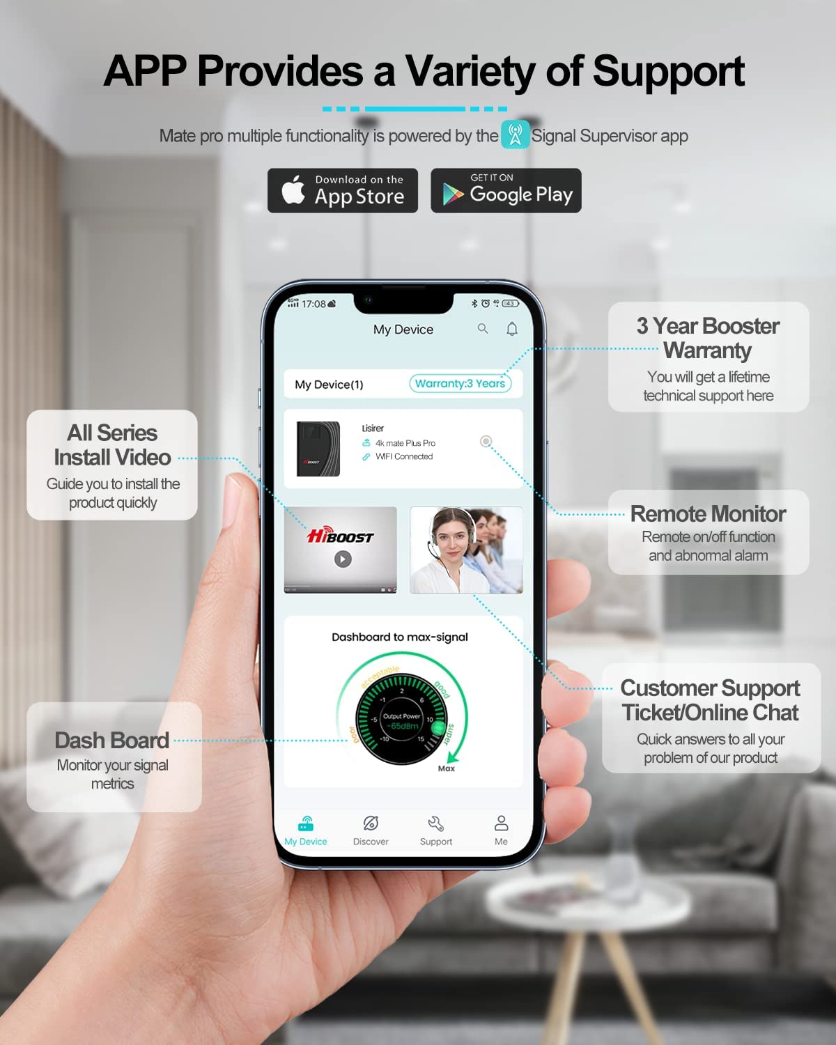 • HiBoost APP – Makes DIY installation even easier with step-by-step instruction. Find the nearest tower. See your signal strength before and after installation.