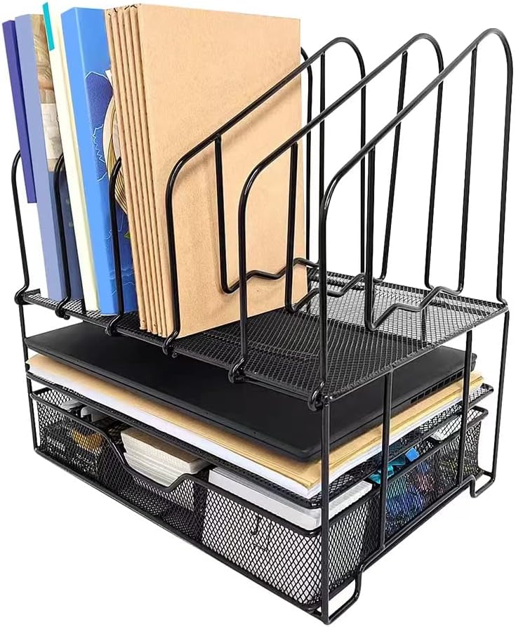• Multi-Functional File Rack: vertical space on the top to store books, reports, magazines, etc. There is a flat tray in the middle to store notebooks, scissors and staplers. The drawer at the bottom provides space for small items, which is very suitable for storing small accessories, such as glue sticks, paper clips, and notes.