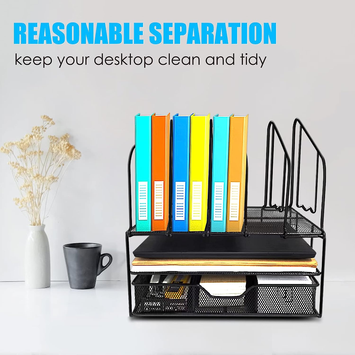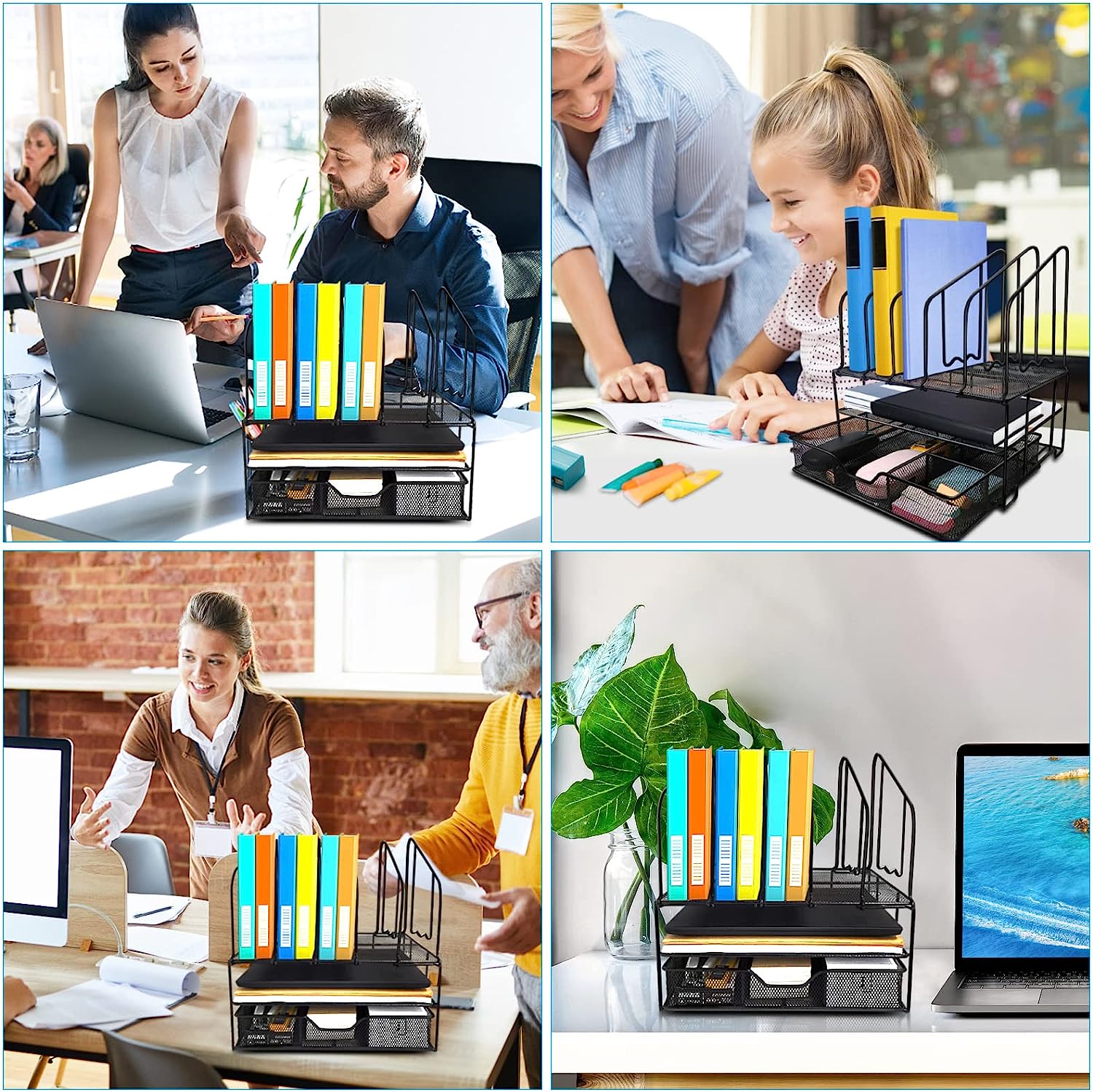 Desk File Organizer with Drawer Anyyuk Office Supplies Organizer with Double Tray and 5 Upright File Folder Holders Sections Desktop Organizer for Workspace Home Office School, Black