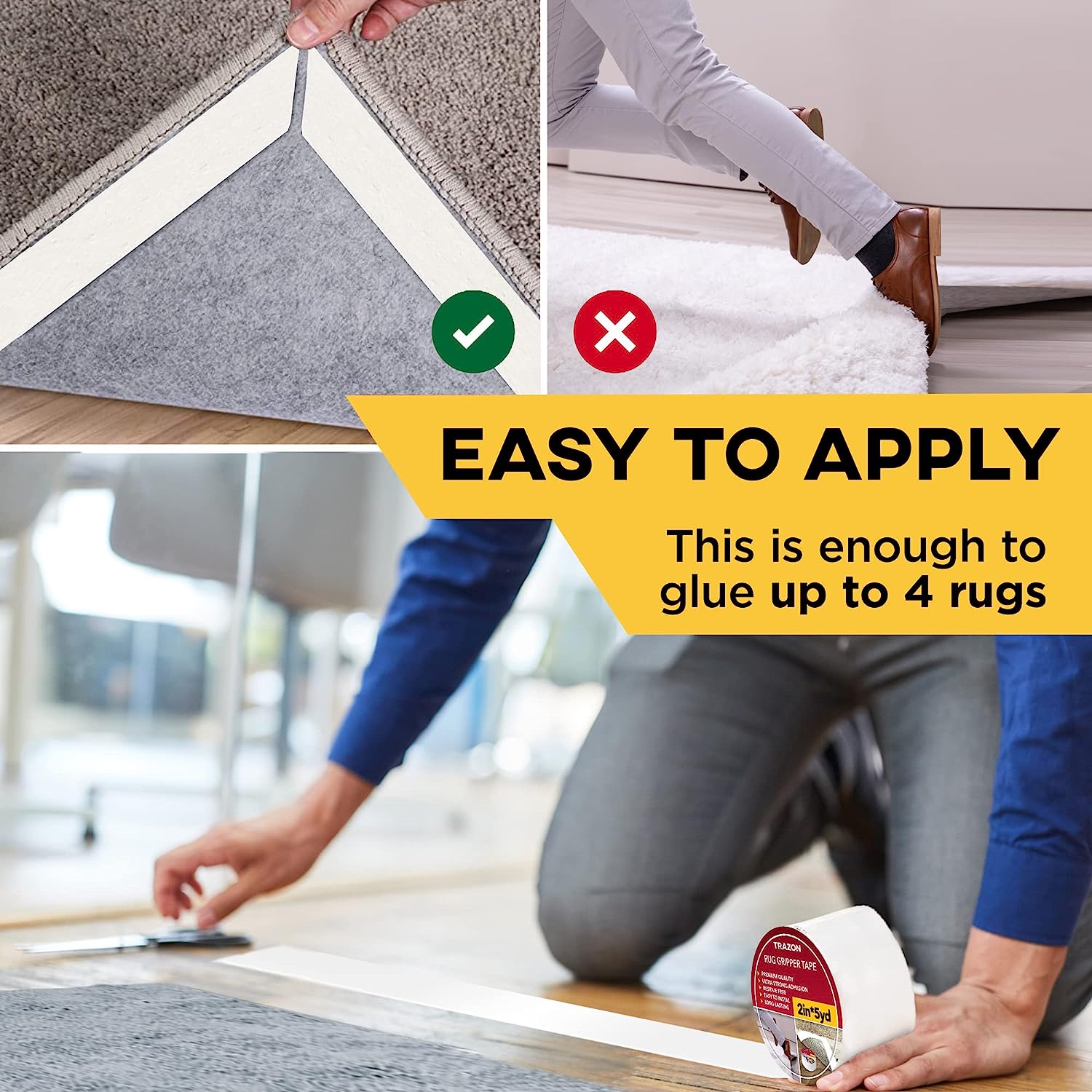 • Rug grippers is 5 Yards Long Roll. It is enough to be used at all of rugs and mats at your home - up to 4 rugs from one roll. You can cut it to 36 pcs by 5 inch each and stick it in the corners and that will be enough. By using this rug pad, all your rugs will looks more elegant and tidy. If your rug is soft and still twists in the middle, you can cut to any desired length and glue the rug along the entire length and width.
