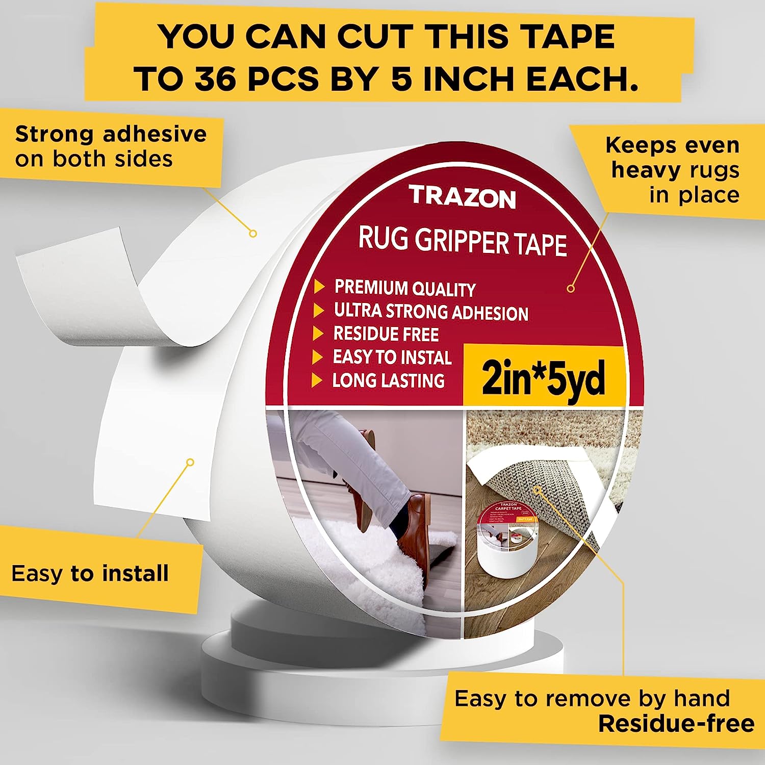 Trazon Carpet Tape Double Sided - Rug Tape Grippers for Hardwood Floors and Area Rugs - Carpet Binding Tape Strong Adhesive and Removable, Heavy Duty Stickers Tape, Residue Free (2 Inch / 5 Yards)