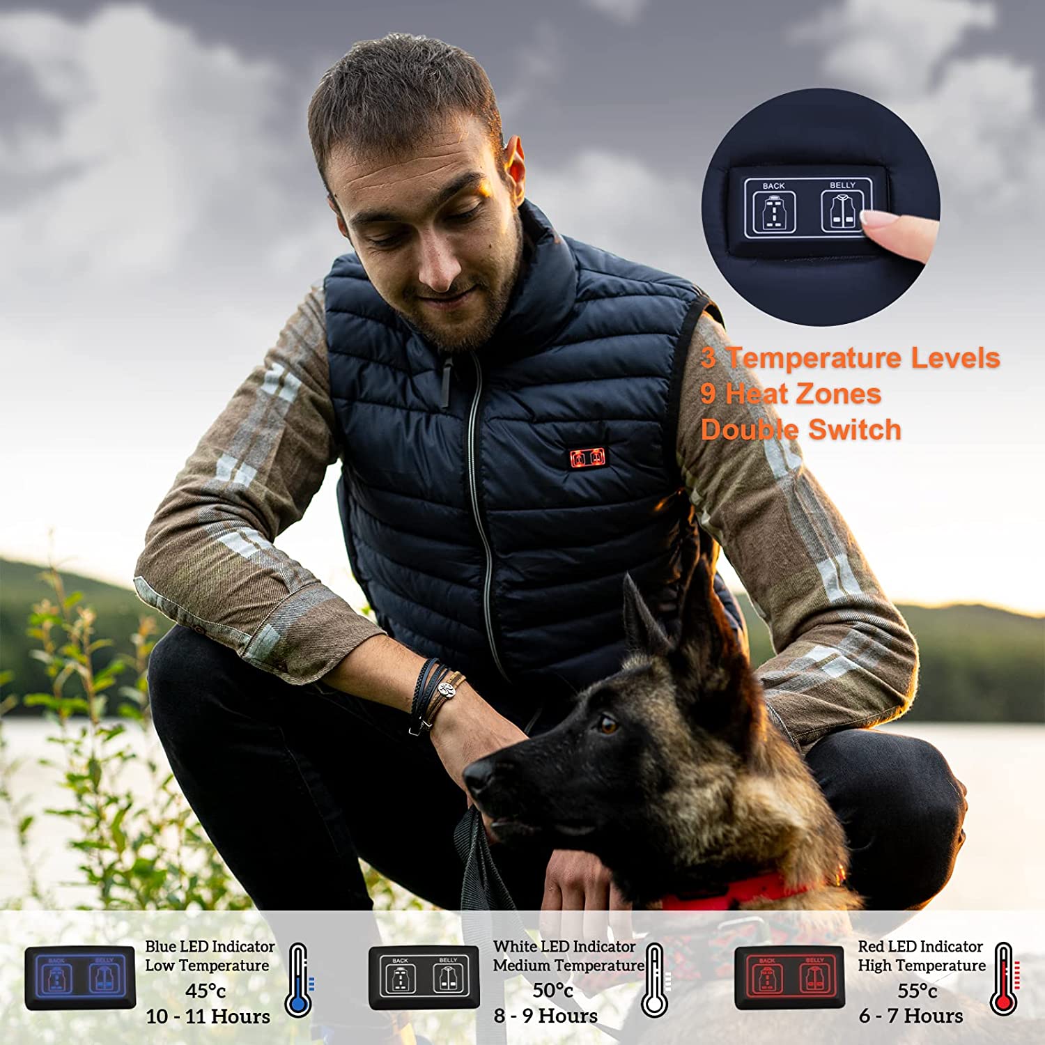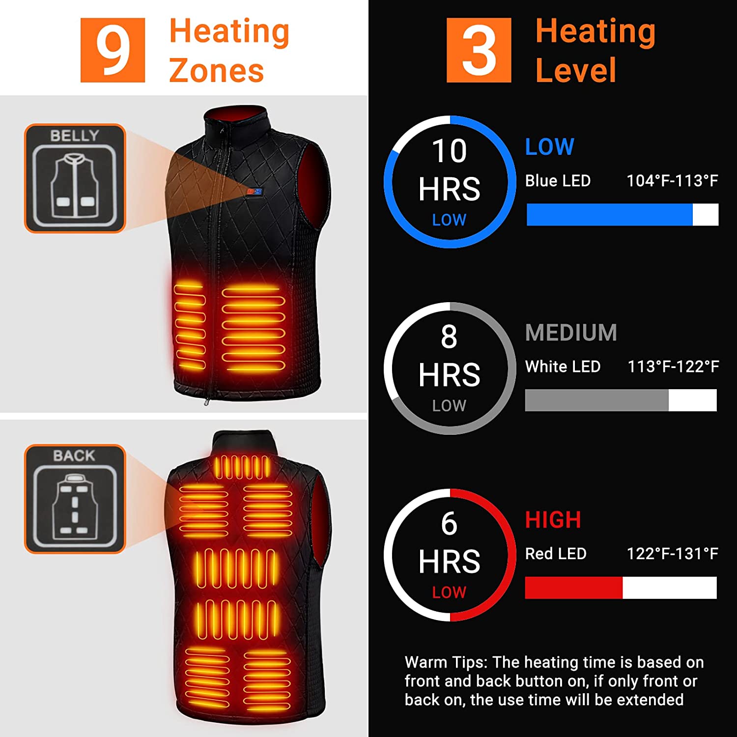 • 9 Heating Zones-The heated vests for men have 9 heating zones, which are Abdomen*2, Mid Back*2, Collar*1, Shoulder*2, Waist*2, the front and back heating zones are independently controlled by two switches. The heating zones are just right to warm up your core and hands in the pockets and the back zone is big enough to cover most of your back, enough warmer. The effective heat therapy to promote blood circulation, great for pain relief, relieve the discomfort of rheumatism & muscles.