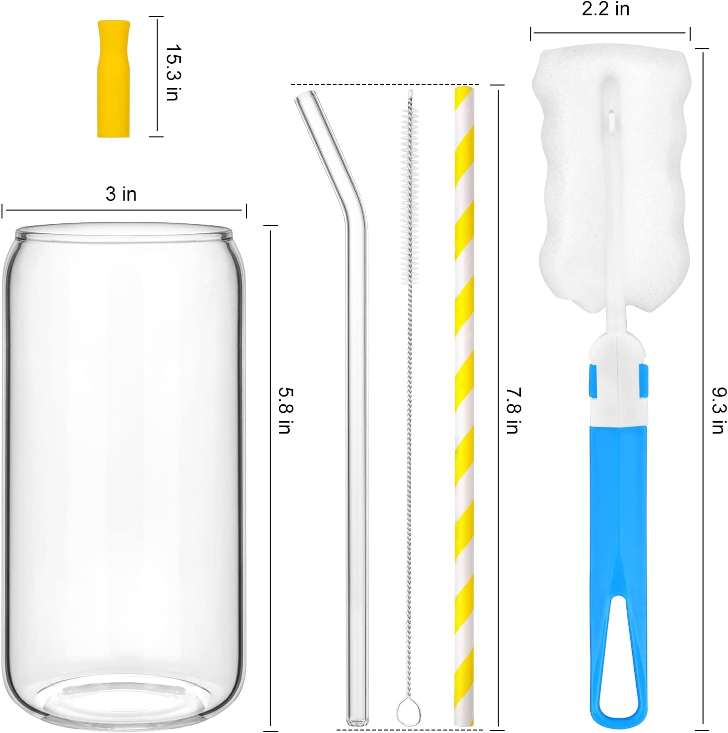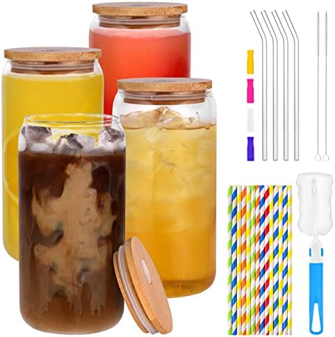 • [CLASSIC ICED COFFEE CUPS SET] The luxury drinking glass set includes 4 pcs 16oz beer shaped glass, 4 bamboo lids, 4 reusable glass straws, 2 straws brush and 1 cup cleaning brush. Perfect size: Diameter - 3", Height - 5.8". Classic style glass cups, simple and refined, ideal for a variety of beverages.