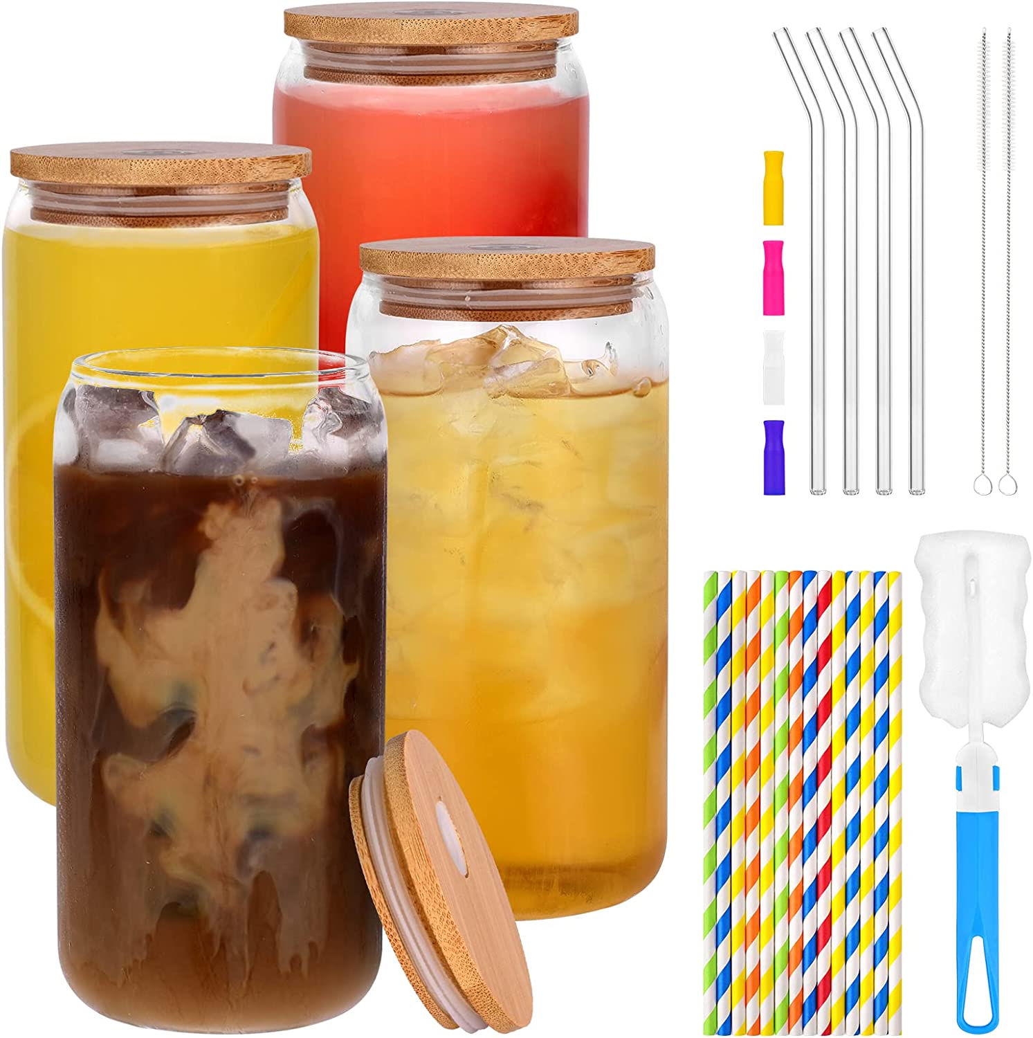 Naeety Glass Cups with Bamboo Lids and Glass Straw, Drinking Glasses Set of 4-16 Oz Beer Can Shaped Glass Cups, Iced Coffee Glasses, Tumbler Cup for Smoothie, Cocktail, Whiskey - 3 Cleaning Brushes