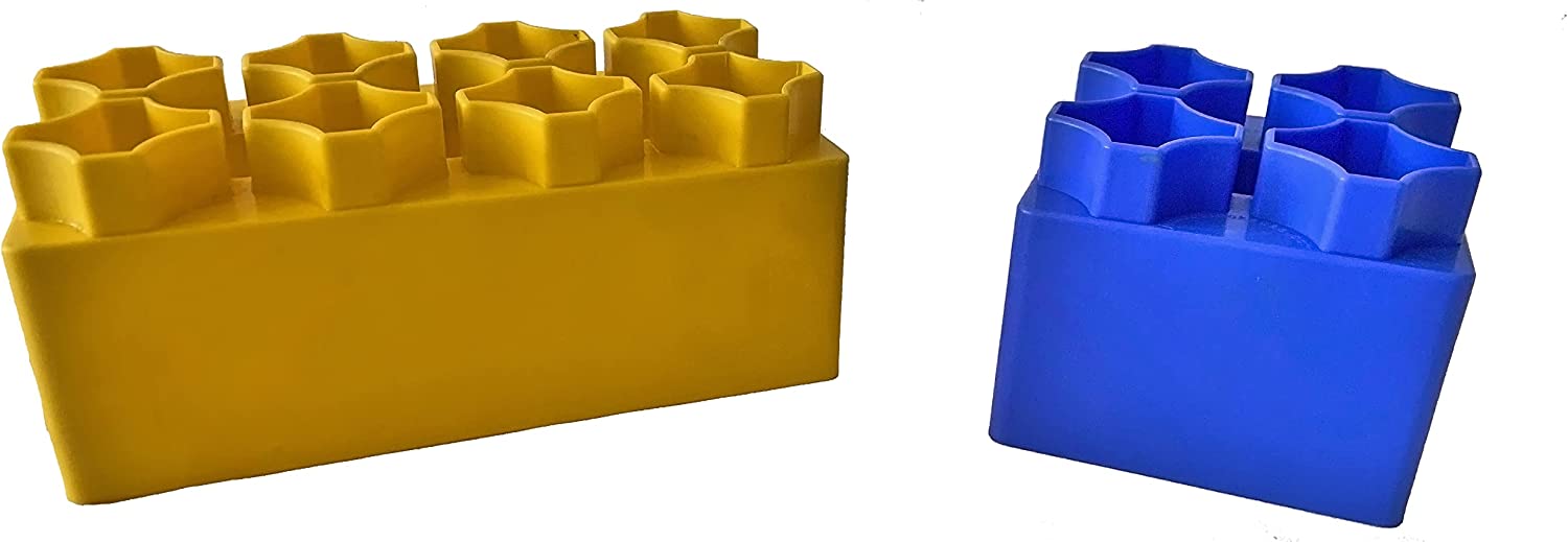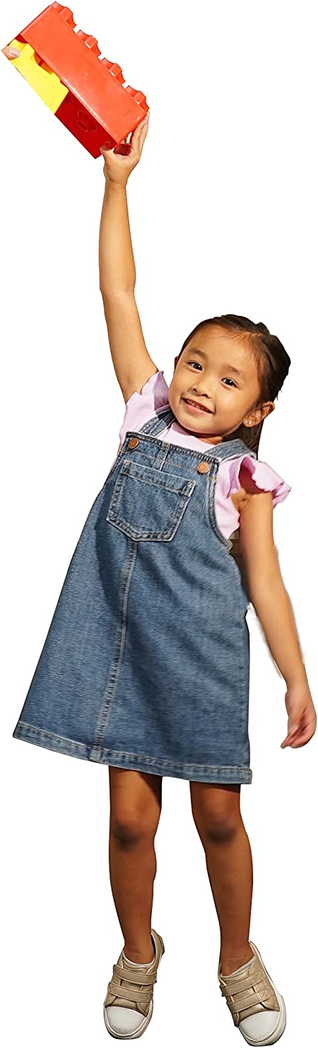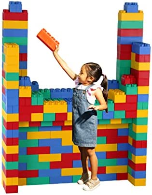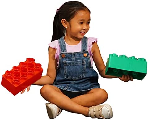 Jumbo Blocks are proudly made in the U.S.A with durable Polypropylene washable plastic material. The oversized and interlocking blocks have smooth round edges for safe for endless play possibilities. Our Blocks are made with safe and unique plastic. Easy clean up just wipe off with a clean wet towel for continuous creativite play. The Super Deluxe Blocks included are 63 pcs Large (8"x4") Blocks and 49pcs Small (4"x4") Blocks in a variety of colors (Red,Green,Blue and Yellow). Colors may vary