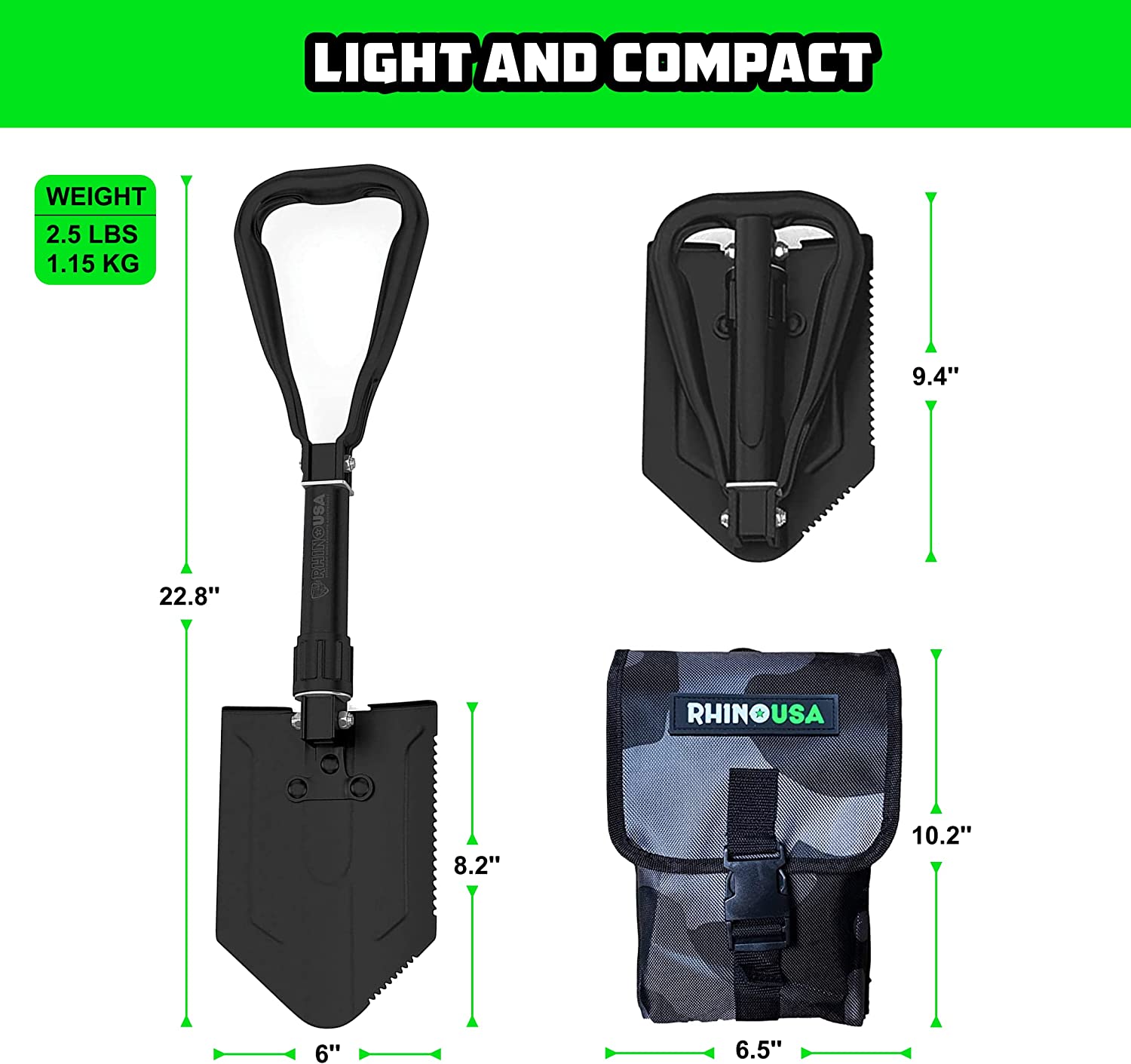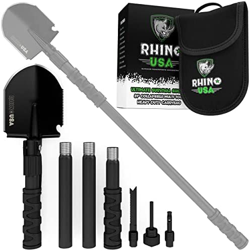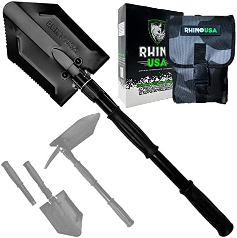 RHINO USA Folding Survival Shovel w/Pick - Heavy Duty Carbon Steel Military Style Entrenching Tool for Off Road, Camping, Gardening, Beach, Digging Dirt, Sand, Mud & Snow.