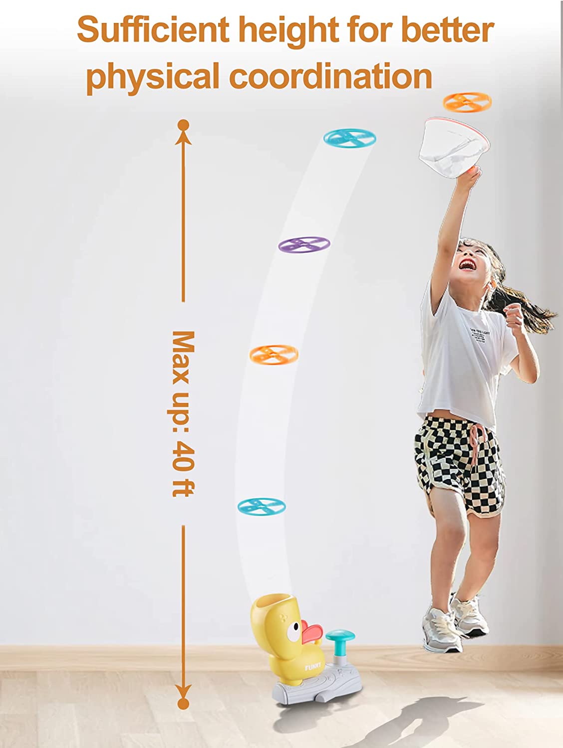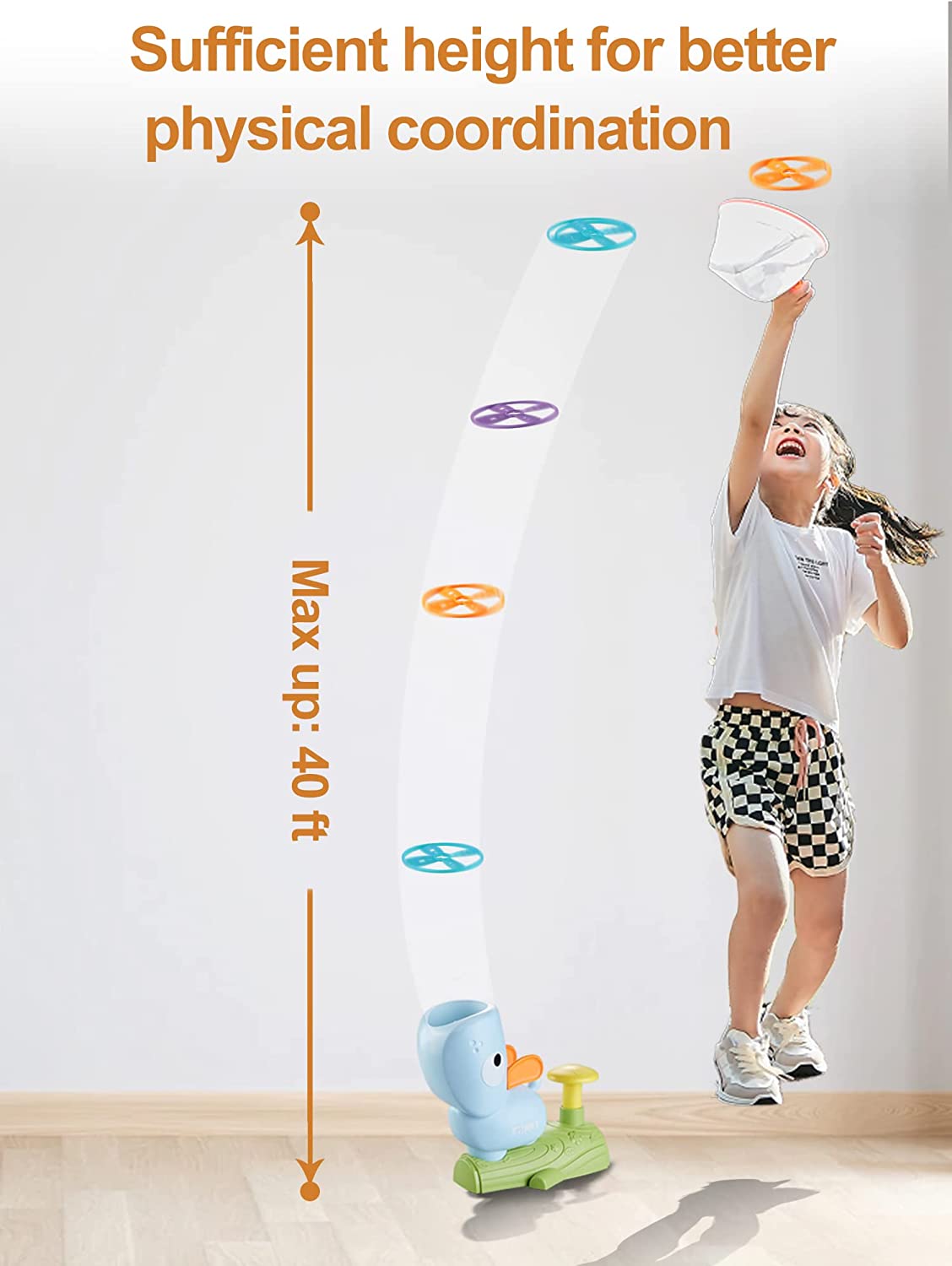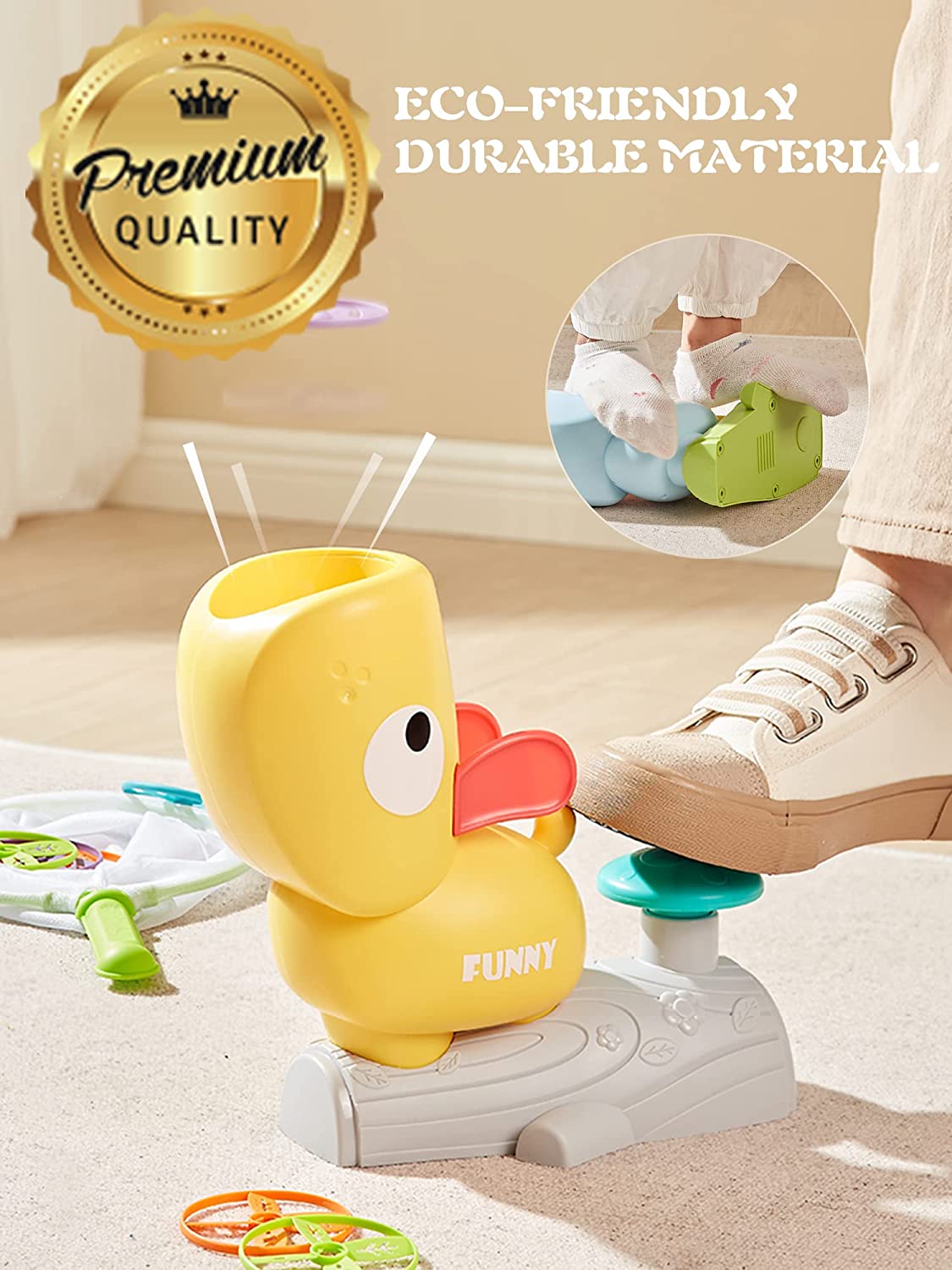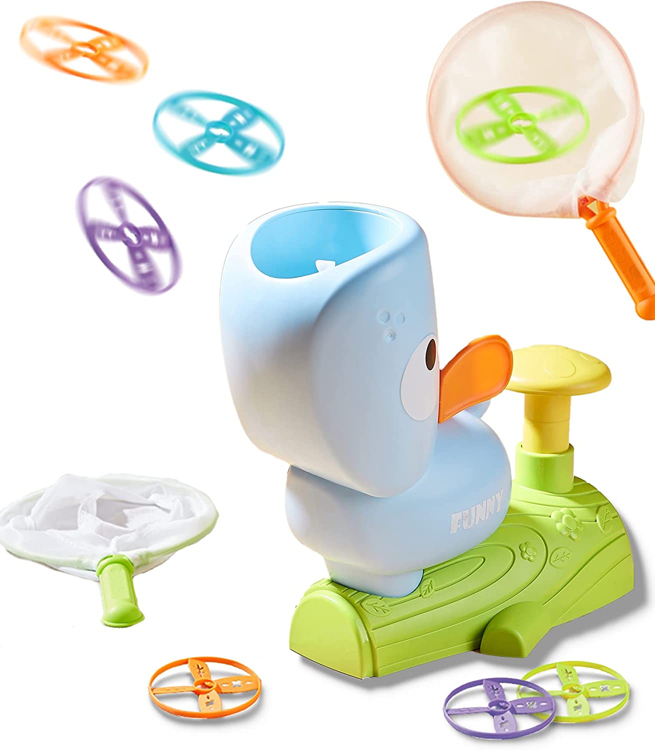 • STEM TOY: Learn by Play. Experiment with how the power comes from foot transforms into thrust that pushes the screw rod turns swiftly, then finally send the flying discs into the air. Exercise gross motor skills and learn about gravity.