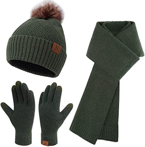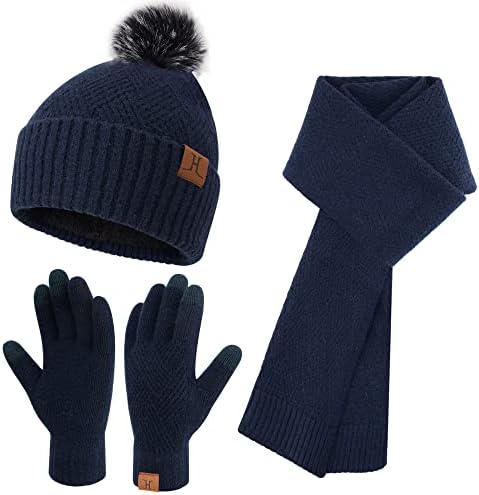 Womens Winter Beanie Hats Long Scarf Neck Touchscreen Gloves Set Knitted Pompom Cap with Thermal Fleece Lined