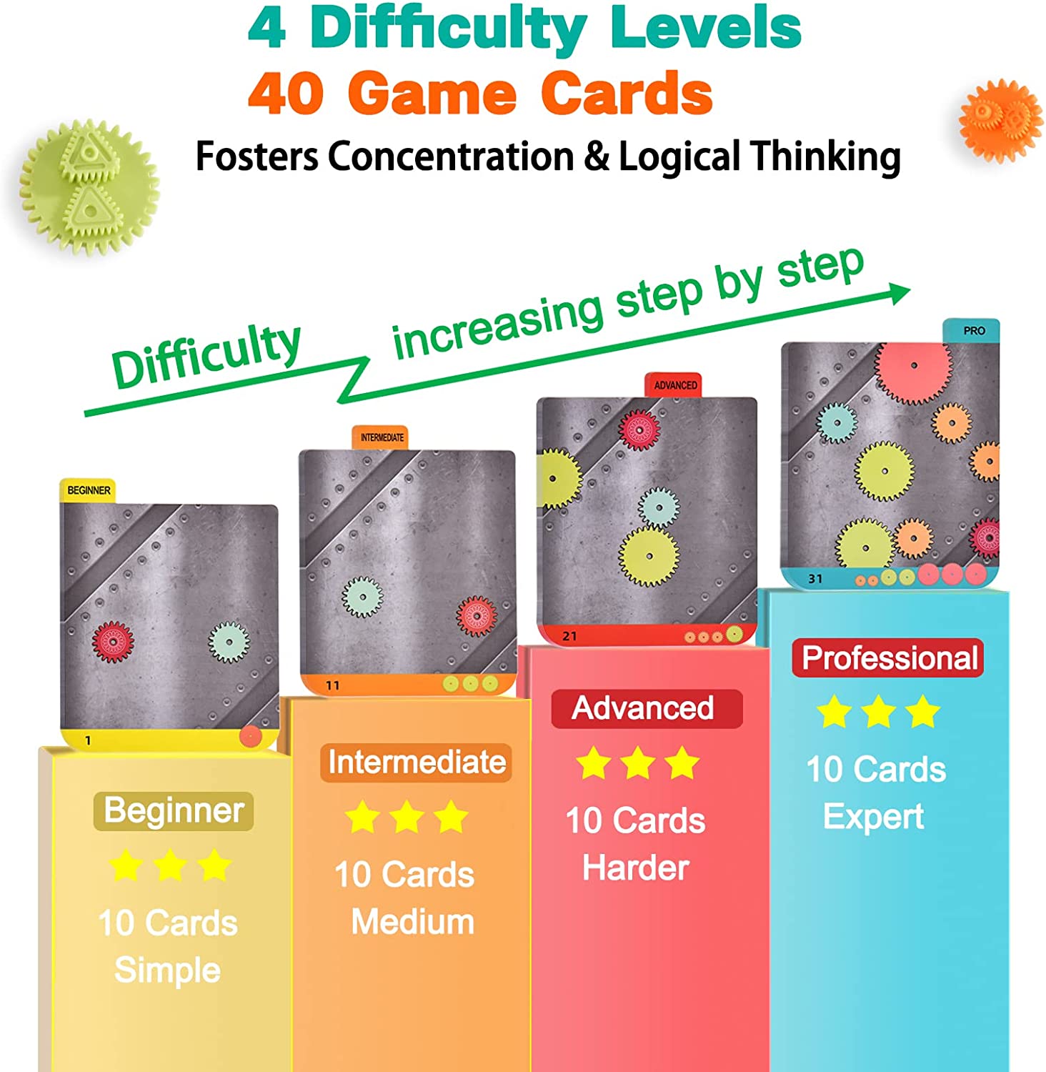 • Have 40 challenge cards, Learn the simple mechanical principles with every chanllenge! Supports STEM by guiding children to make the gear spinning in every chanllege. Learning gets more intricate as children’s abilities advance.