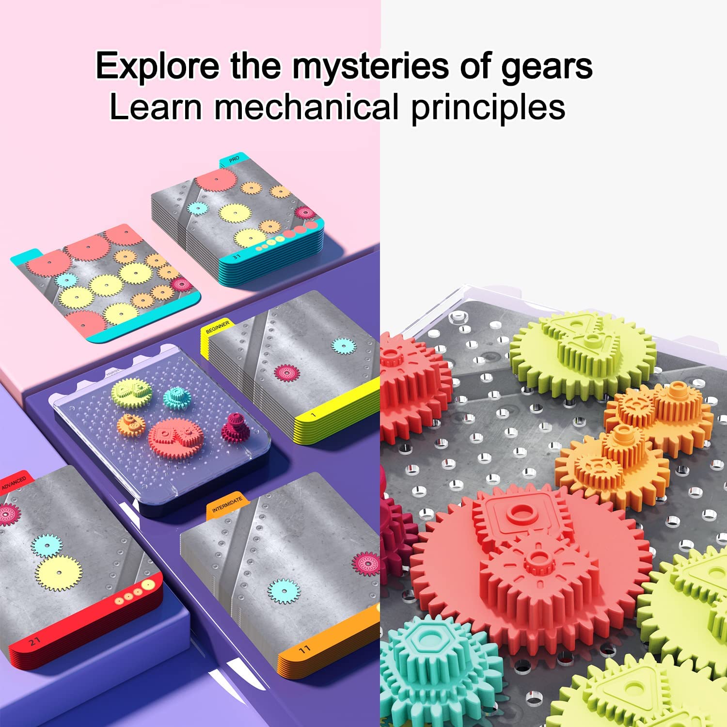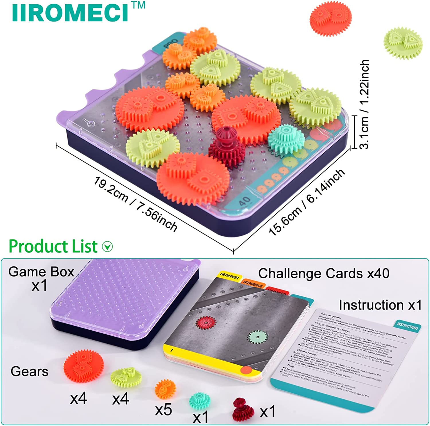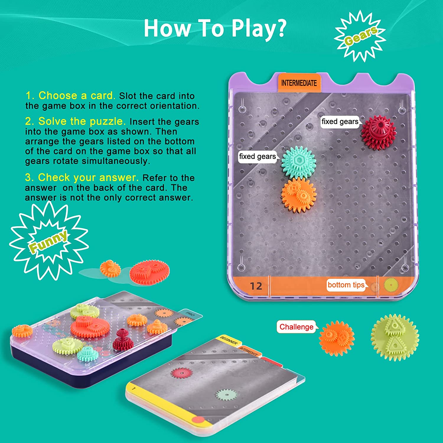• Fun and interactive gear game:Choose a card and insert the gear into the game box as shown. Then arrange the remaining gear on the game box so that all the gear rotate simultaneously. The answer on the card is provided as a reference and is not the only correct answer.