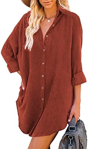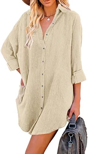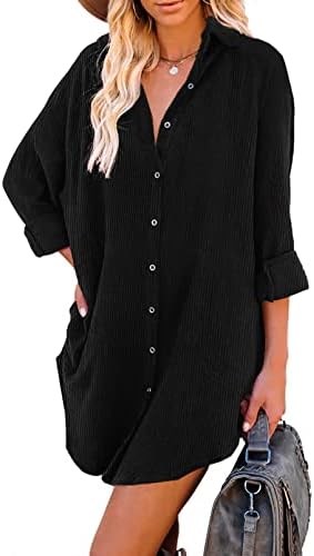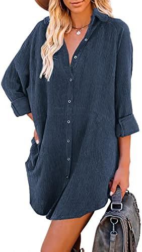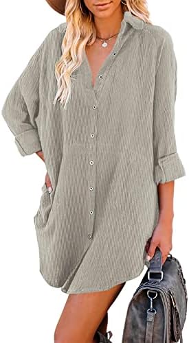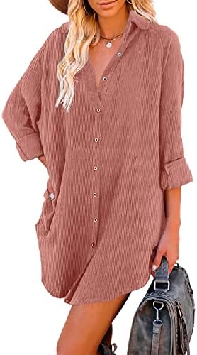 Astylish Women Casual Long Sleeve Button Down Oversized Corduroy Shirt Dress with Pocket