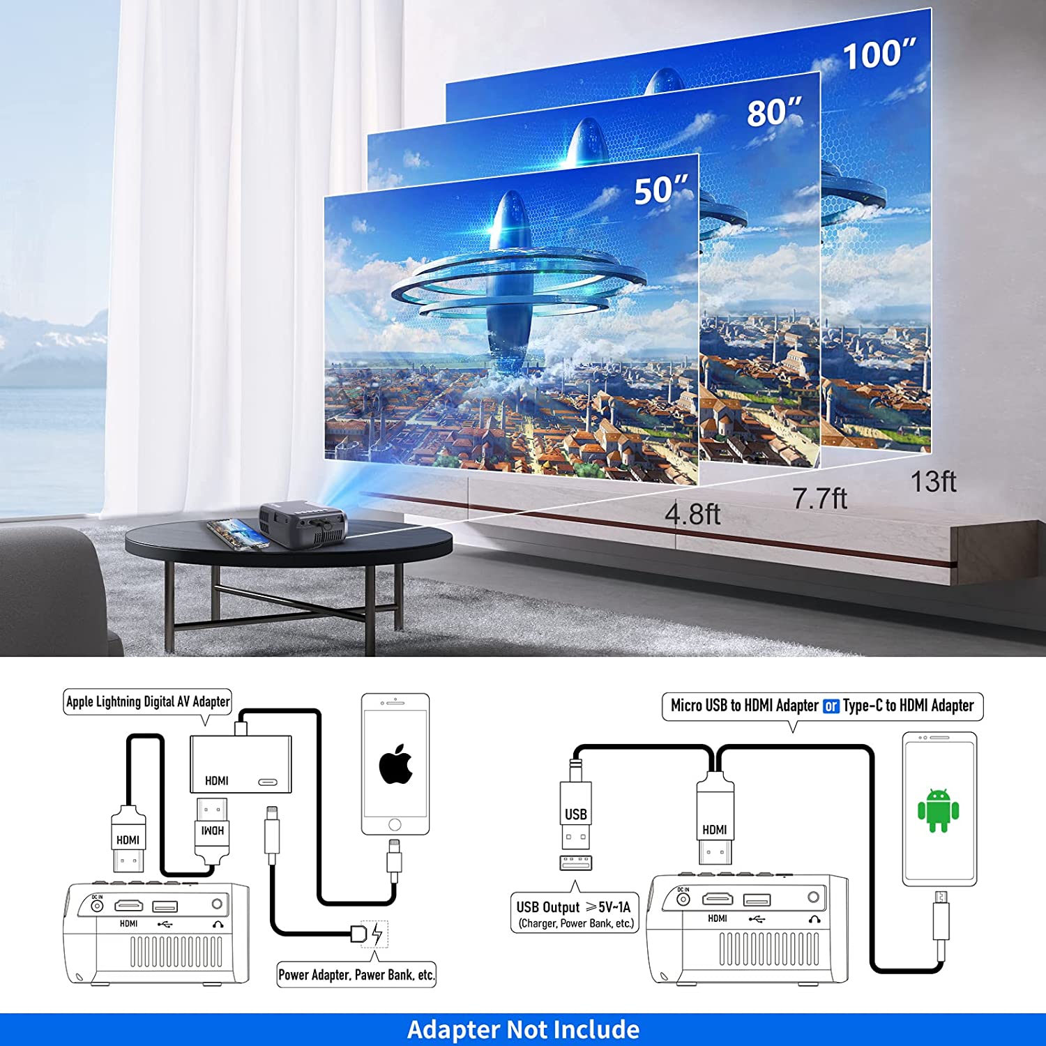 • Multiple Devices Connection: Small movie projector is equipped with multiple ports, including HDMI, USB, audio and other interfaces.It can be easily connected to multiple media devices, such as TV boxes, laptops, desktop computers, digital cameras and iPad,smartphones(When connect with phone, please purchase an extra HDMI adapter).