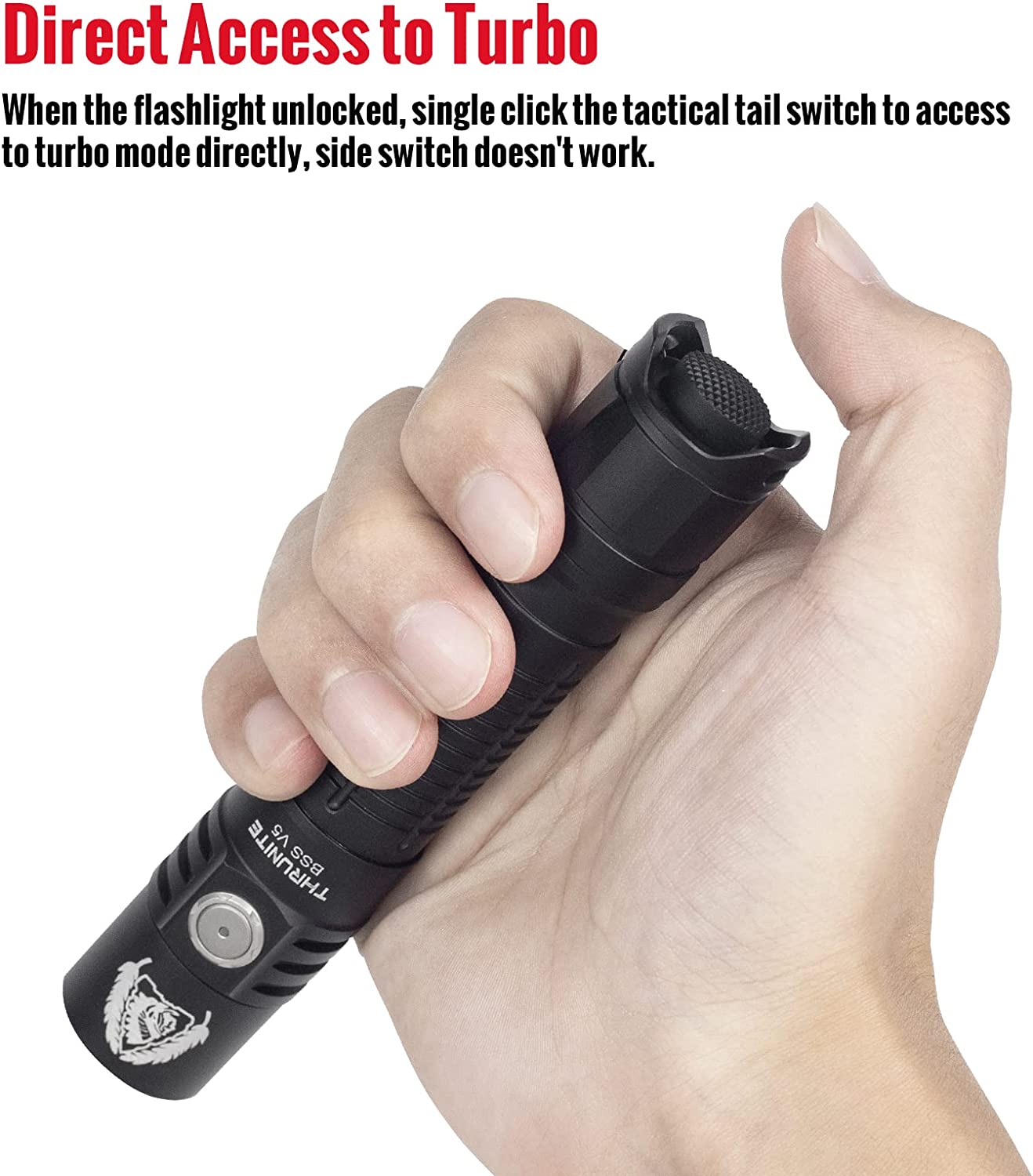 • SIX LIGHTING MODES: Intelligent Firefly/ Low / Medium / High / Turbo /Strobe light modes makes this handheld flashlight suitable for many indoor and outdoor activities. Fast access to turbo when the BSS V5 torch unlocked.
