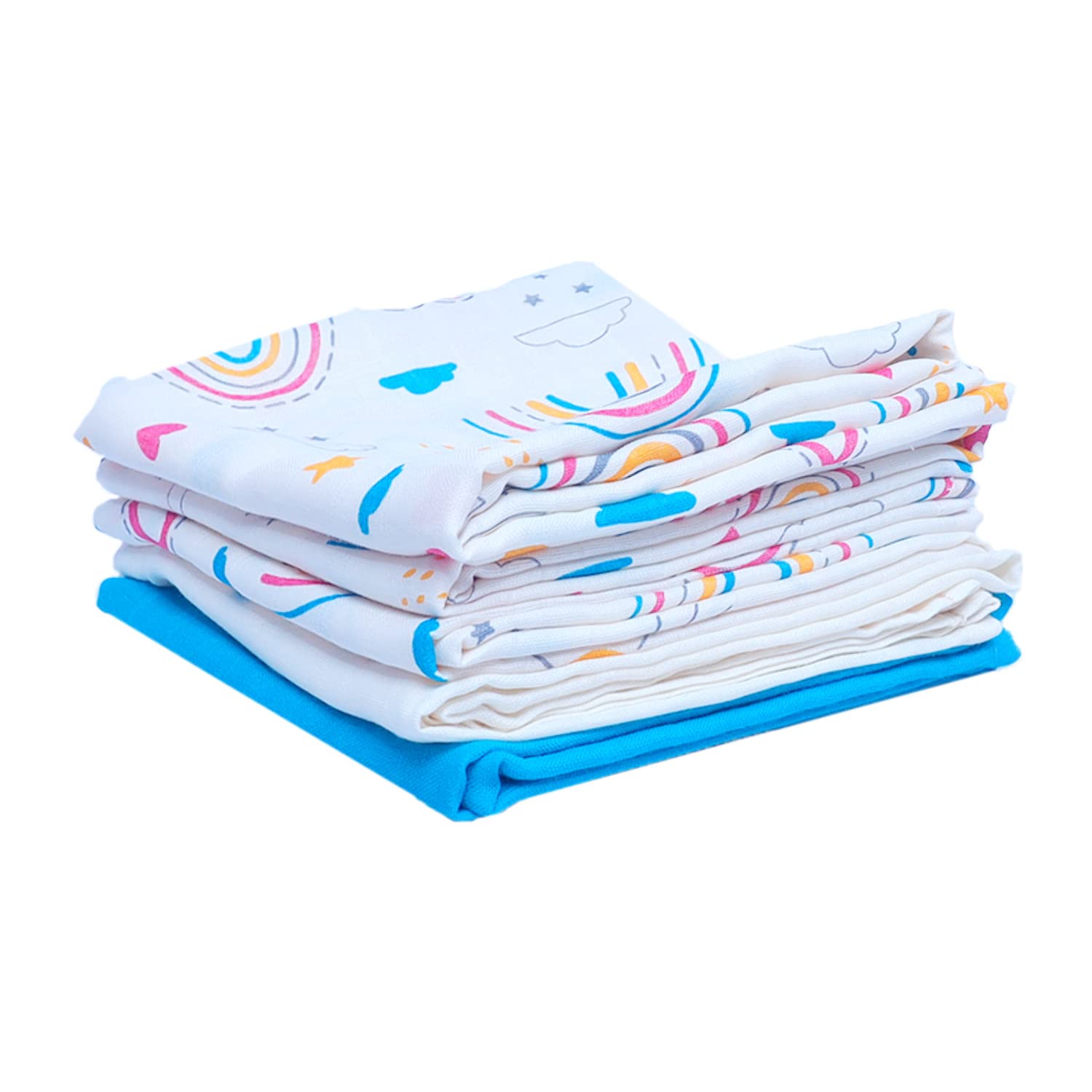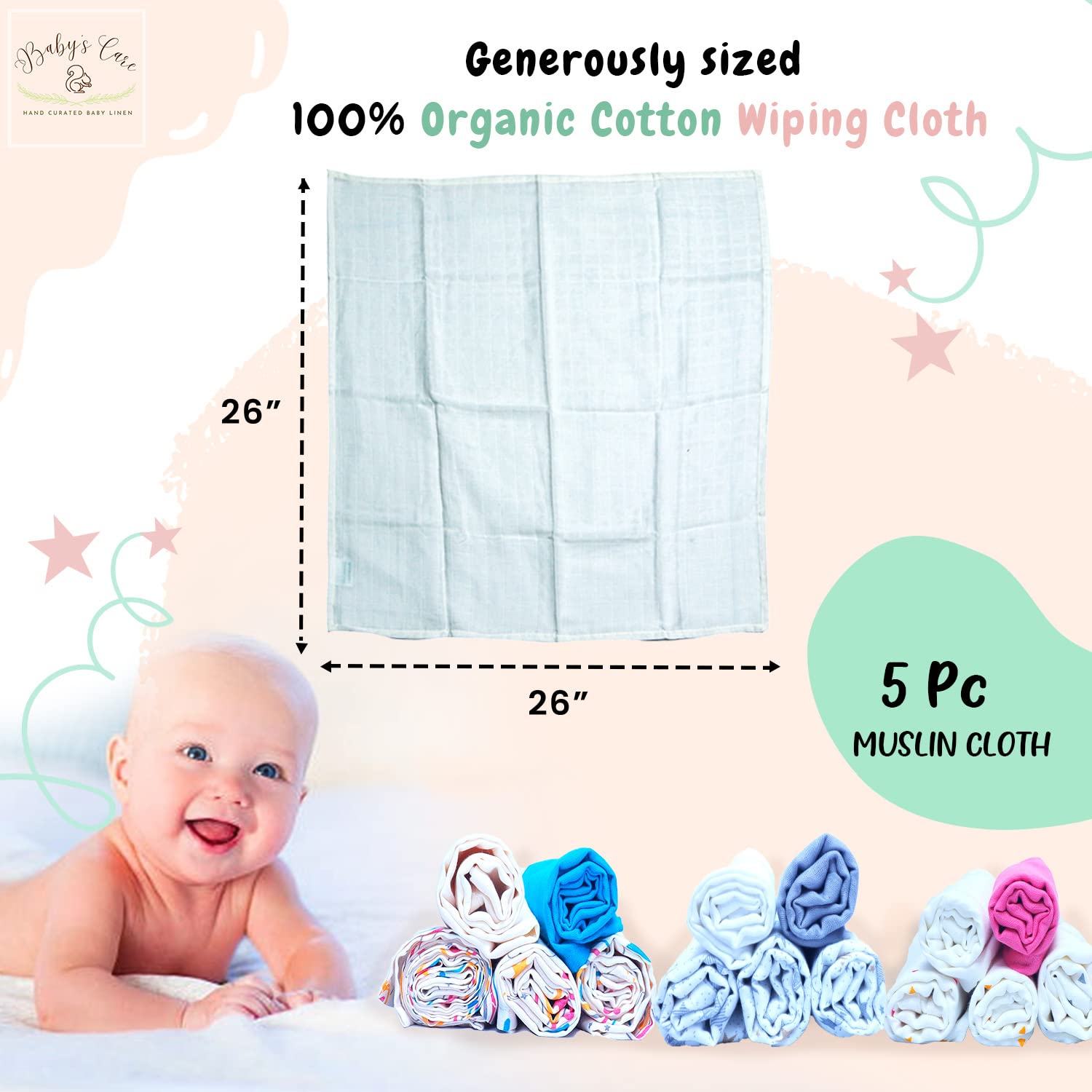 BABYS CARE Muslin Burp Cloth Pack of 5 | 100% Organic Cotton | Versatile Use Washcloth Face Cloth Cleaning Mess | Lightweight Baby Towel | Handy for Changing Cleaning Feeding Baby | 26"x26" | Rainbow