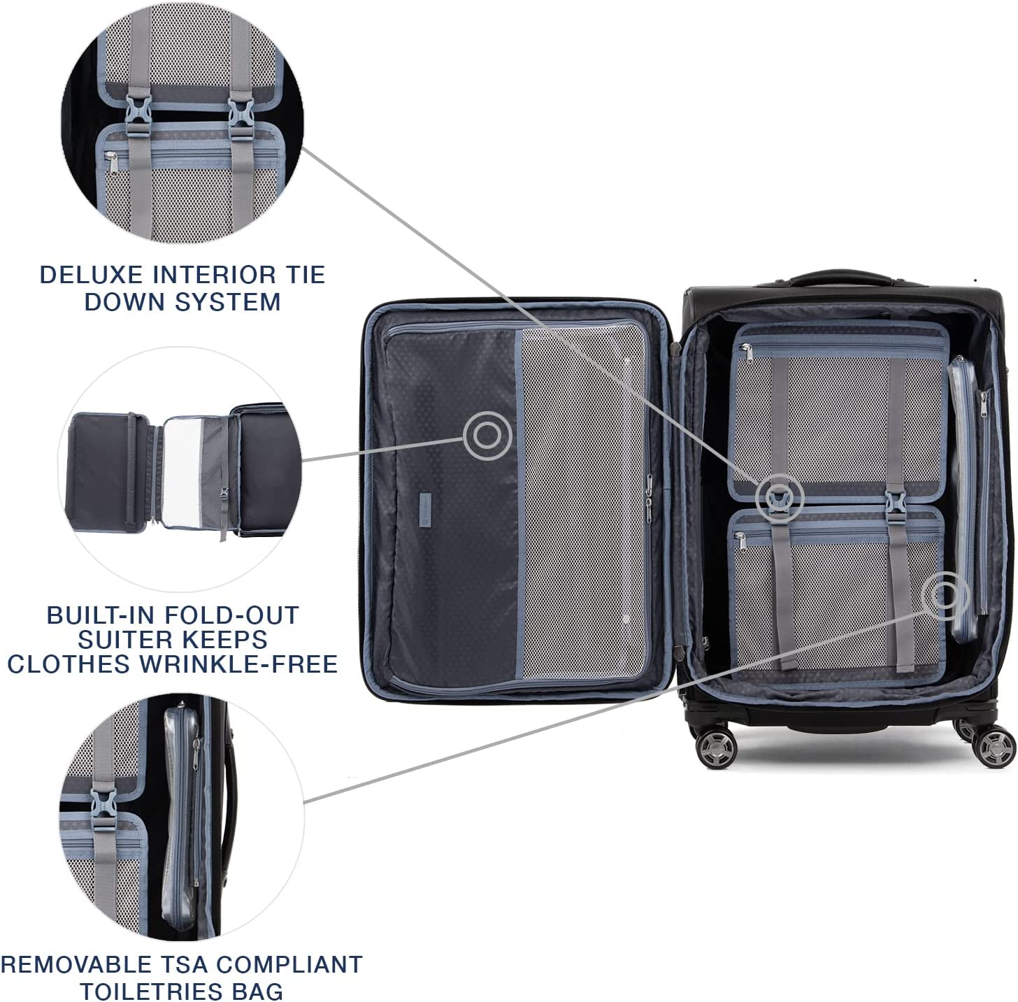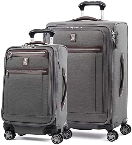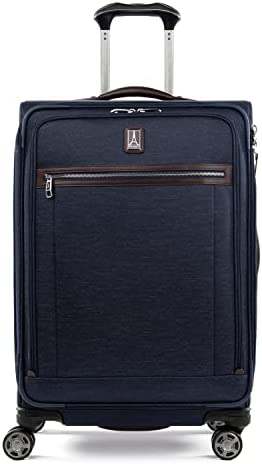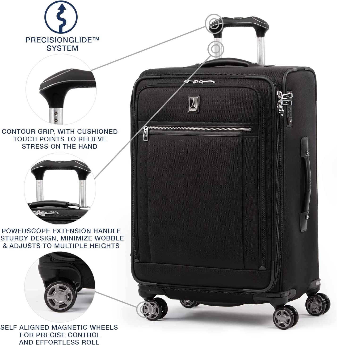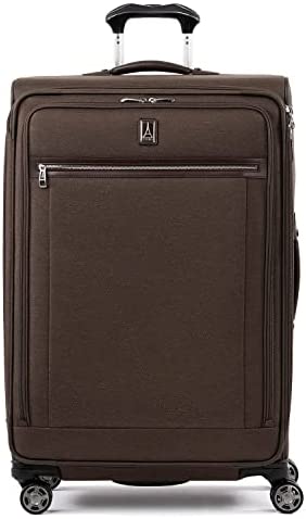 Finally, great looking checked luggage that is as functional and durable as it is stylish. The Platinum Elite 25" Expandable Spinner is perfect for medium and long trips, accommodating everything you need, guarding against wrinkles with a built-in suiter and keeping everything organized under a deluxe tie-down system with integrated accessory pockets. Constructed with premium fabrics, leather accents and chrome zippers, this gorgeous bag also features a tip-resistant tapered expansion option that provides up to 2" additional packing capacity. Integrated lock allows TSA authorities to safely unlock and lock suitcase for inspection when needed (default lock code is 0-0-0 to open). For effortless mobility, this 25" suitcase is equipped with our Precision Glide system-eight MagnaTrac, self-aligning, 360-degree spinner wheels guided by an adjustable PowerScope extension handle with patented Contour Grip and rubberized touch points, ergonomically designed to be easy on the hands. Backed by Travelpro built for a lifetime limited warranty with our trusted companion promise which covers the cost of repair for damage from airline or other common carrier for 1 year.