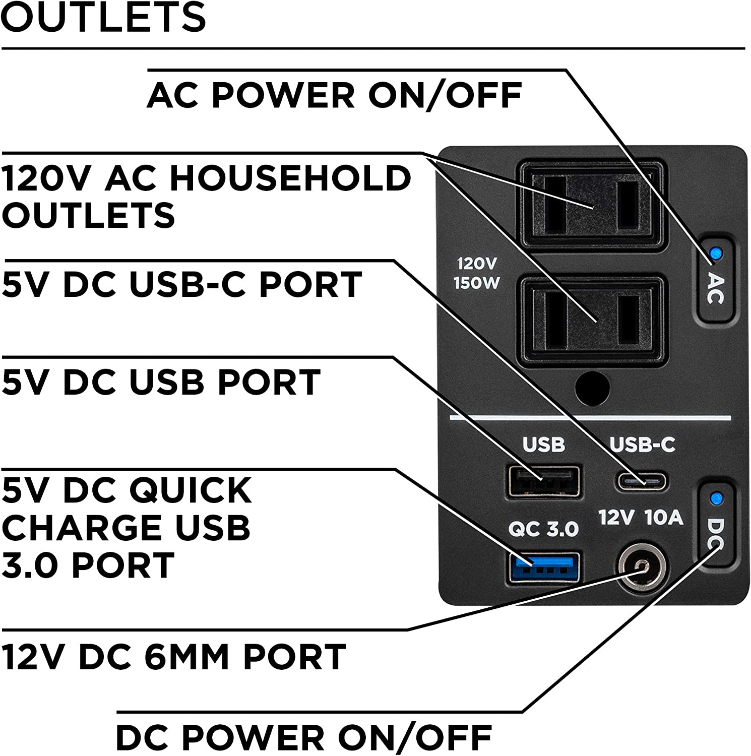 • VERSATILE OUTLETS CHARGE UP TO 6 DEVICES AT THE SAME TIME: Pushing 150 Rated and 300 Peak Watts Through (2) 120V Household Outlets, (1) USB Port, (1) Quick Charge USB Port, (1) USB-C Port, (1) 6mm 9-12V DC Outlet, (1) 12V Cigerette Lighter Outlet - Strong Enough To Easily Power 50″ LED TV, Humidifer, or Refrigerator
