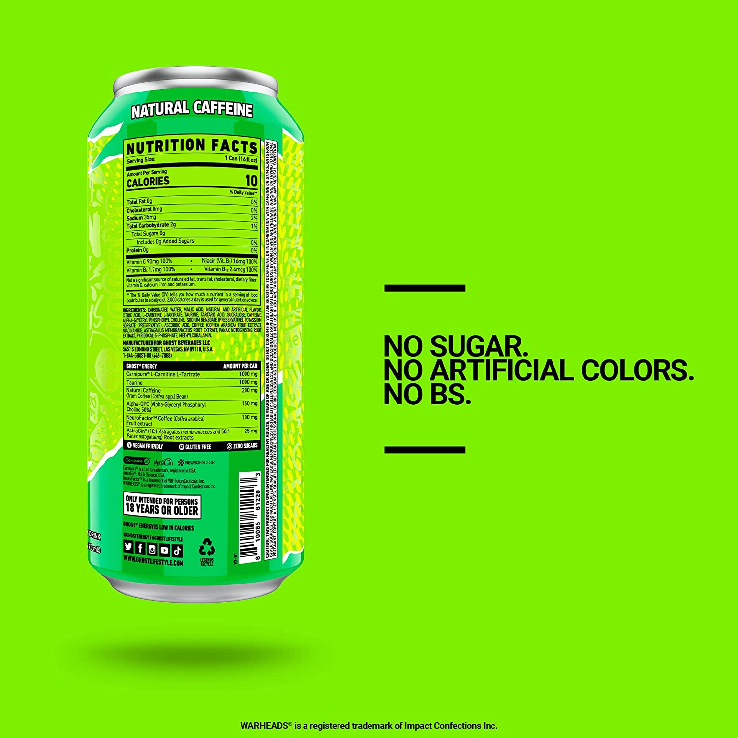 • Feel-Good Energy: GHOST ENERGY is the fully transparent, fully loaded energy drink we’ve all been waiting for. No sugar. No artificial colors. No BS. Authentic Warheads Sour Green Apple flavor. 12-pack.