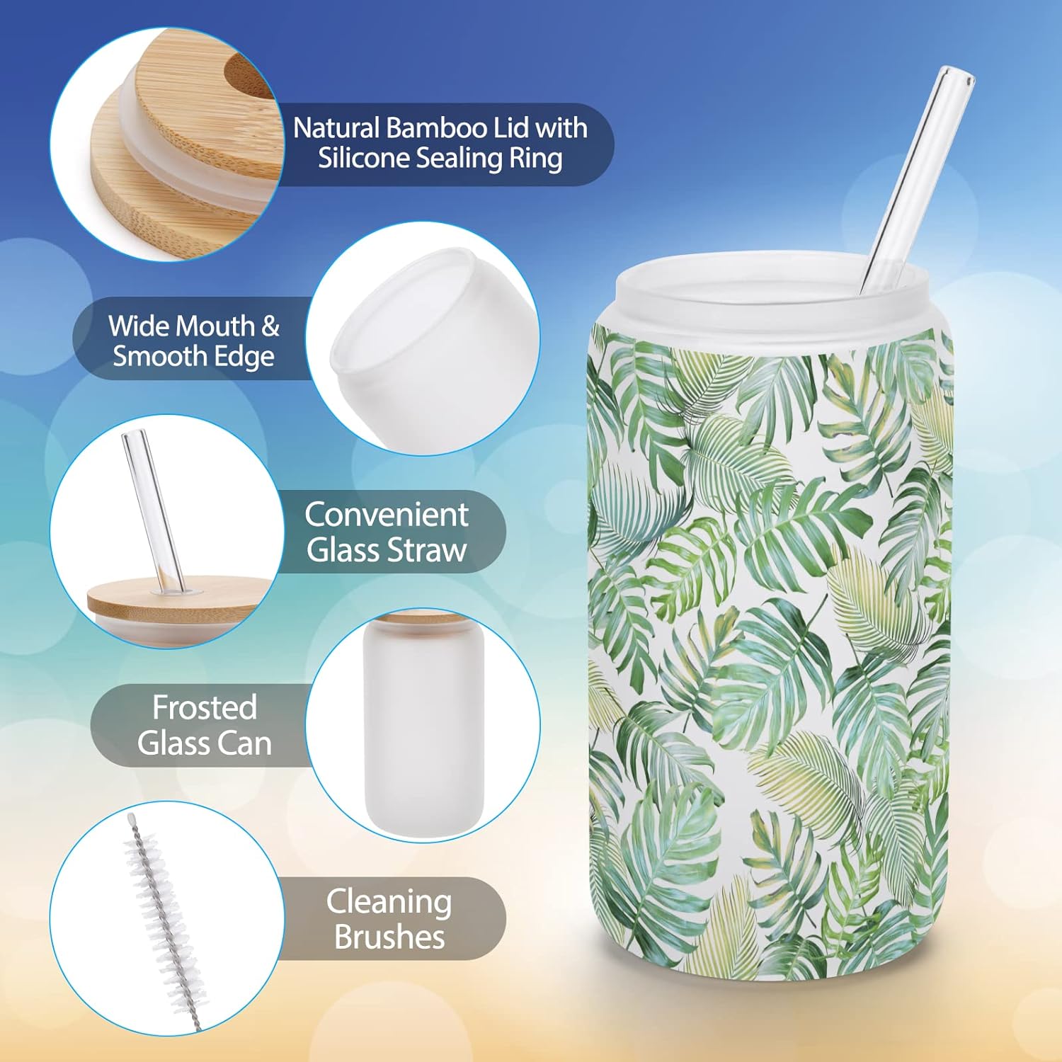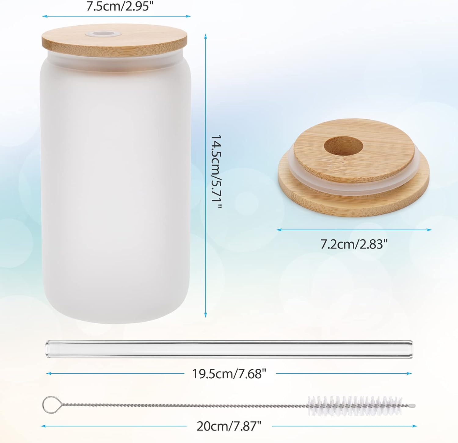 Qinkada Sublimation Glass Blanks with Bamboo Lid, 18OZ Mason Jar Drinking Glass, Portable Travel Drinking Jars Reusable Beer Can Glass with Straws and Brushes, 6 Pack