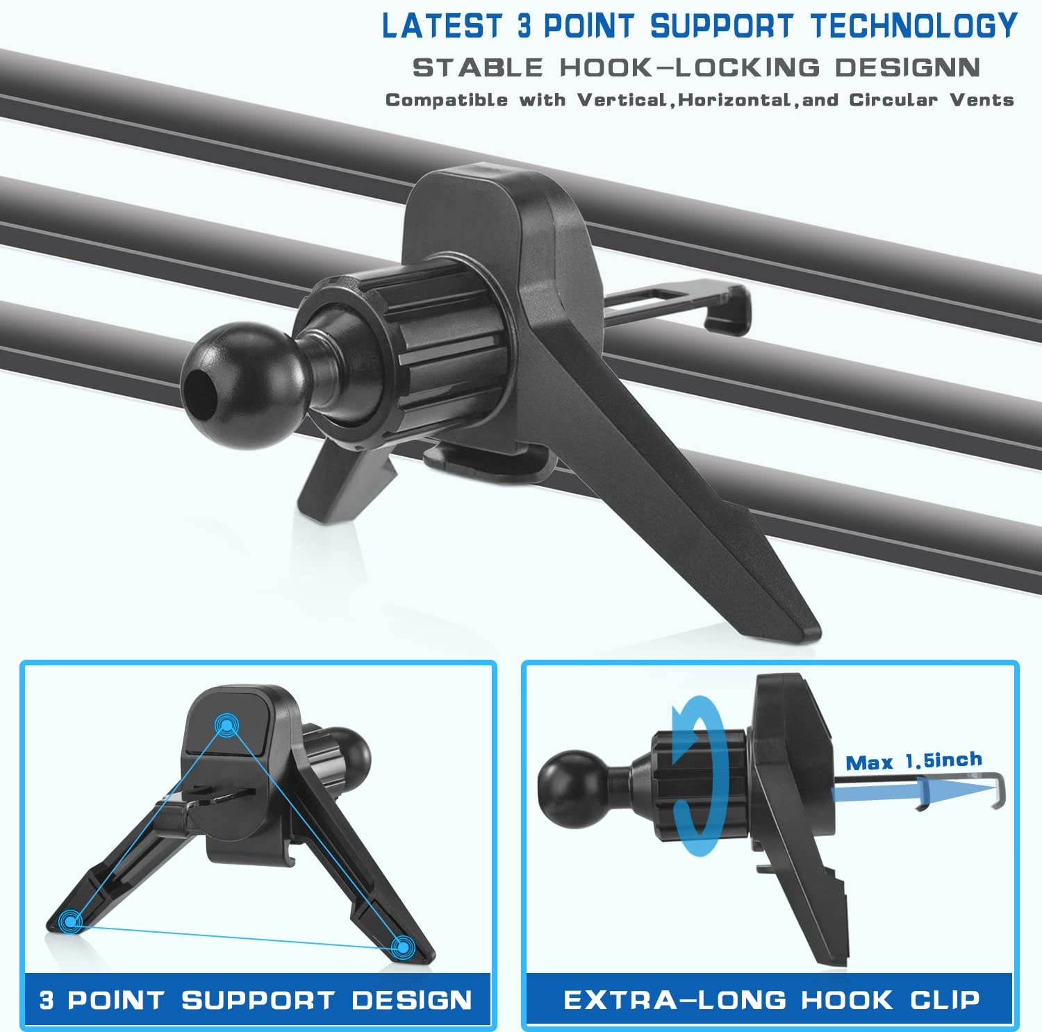 【Vent clip hook】: HOLDCY car phone holder using the latest screw mechanical lock function, tighten the metal clip hook will steadily grab the car vent blades, with triangular fixed support stability, so that your smartphone firmly fixed in the vent above, will not let you distracted while driving