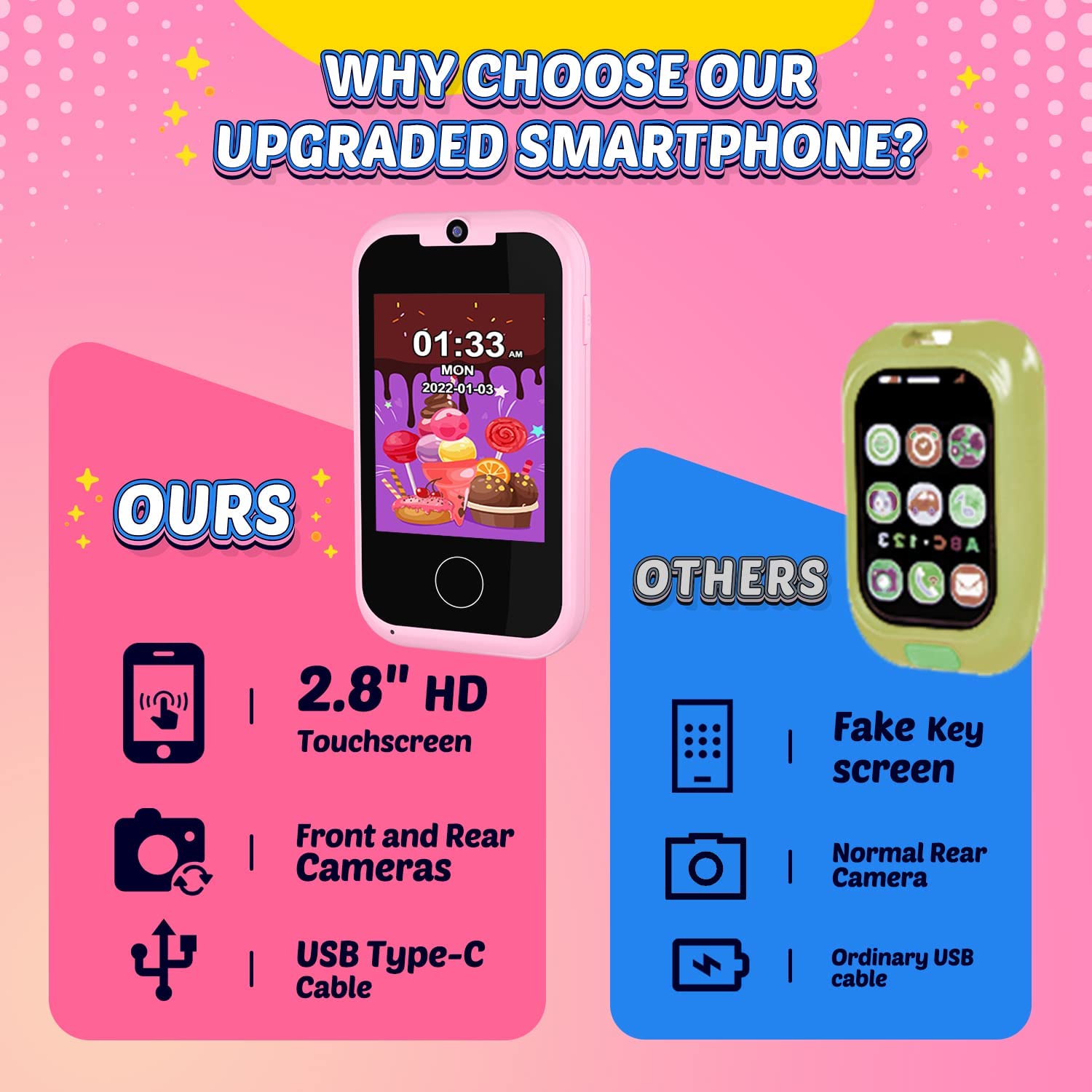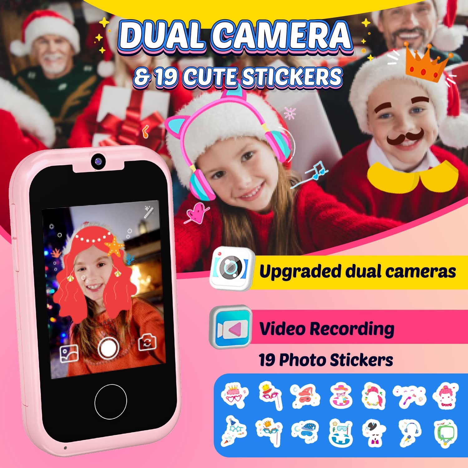 • ?【Upgraded Smart Cell Phone for Kids】Combining kids phone & MP3 music player to design a role-playing 2.8" touchscreen cell phone for toddlers. Equipped with auto Focus, 8.0 Mega pixels and Video. Greatly improved the definition of photos. Kids can choose Big head stickers to take photos and leave some funny pictures for family or friends. And it has a high-quality speaker that can support a 3.5mm headphone jack. It is good for children to learn and listen to music.